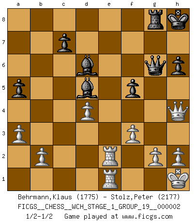 Last move : 1/2-1/2 2007 May 1 3:19:3 [Event "FICGS__CHESS__WCH_STAGE_1_GROUP_19__000002"] [Site "FICGS"] [Date "2007.01.16"] [Round "1"] [White "Behrmann,Klaus"] [Black "Stolz,Peter"] [Result "1/2-1/2"] [WhiteElo "1775"] [BlackElo "2177"] 1.e4 e5 2.Nf3 Nf6 3.Nxe5 d6 4.Nf3 Nxe4 5.d3 Nf6 6.d4 Nc6 7.Nc3 d5 8.Bb5 Bb4 9.Qe2+ Ne4 10.Bxc6+ bxc6 11.Nd2 O-O 12.Ncxe4 Re8 13.c3 Bf8 14.O-O dxe4 15.Nxe4 f5 16.Bg5 Qd5 17.Nf6+ gxf6 18.Qxe8 Bb7 19.Qe3 c5 20.f3 cxd4 21.cxd4 fxg5 22.Qxg5+ Kh8 23.Kh1 Qf7 24.Rae1 Bd6 25.Rf2 Rg8 26.Qh4 Bd5 27.a3 a5 28.Rc2 Qg7 29.Rd2 Qg6 30.Rde2 h6 1/2-1/2 Petrov : French attack Kingside Castling by player Black (move 11) Kingside Castling by player White (move 14) This chess game ended in a draw. Follow this game move after move (download)When you don't know what to play, wait for an idea to come into your opponent's mind. You may be sure that idea will be wrong. (Siegbert Tarrasch) Der Verteidiger gebe der Gewalt nach, aber nur der Gewalt. Er schaffe sich nicht freiwillig, etwa aus Blindheit oder aus Schrecken, irgendwelche Schwächen. Er lasse sich nicht bluffen. (Emanuel Lasker) No hay otro maestro que tenga una voluntad terrífica de ganar. Al tablero, el irradía peligro y aún los oponentes mas fuertes tienden a congelarse como liebres cuando olfatean a una pantera. Aún sus debilidades son peligrosas. Con las blancas, su juego de apertura es predecible - te es posible hacer planes en su contra - pero es tan fuerte que tus planes casi nunca funcionan. En el juego medio, su precisión e invención son fabulosas y en finales, tú simplemente no le puedes vencer. (Experto Alemán anónimo) Pour moi, les échecs ne sont pas un jeu mais un art. (Alexandre Alekhine) Good decisions come from experience, and experience comes from bad decisions. (Anonymous)