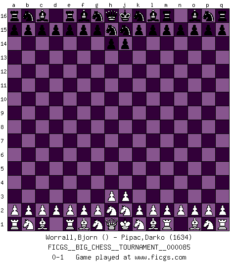 Last move : 0-1 2012 September 22 7:54:45 [Event "FICGS__BIG_CHESS__TOURNAMENT__000085"] [Site "FICGS"] [Date "2012.08.23"] [Round "1"] [White "Worrall,Bjorn"] [Black "Pipac,Darko"] [Result "0-1"] [WhiteElo ""] [BlackElo "1634"] 0-1 This big chess game has been lost on time (started : 2012.08.23 2:33:36) Follow this game move after move (download)Those who say they understand Chess, understand nothing. (Robert Hubner) Das ganze Leben mit einer Ehefrau ist wie ein Endspiel mit ungleichfarbigen Läufern. (Viktor Kortschnoi) Un juego de Ajedrez es un dialogo, una conversación entre un jugador y su oponente. Cada movimiento del oponente puede contener amenazas o tropiezos, pero un jugador no se puede defender de las amenazas o tomar ventaja de los tropiezos si es que no se pregunta a sí mismo: ¿Que es lo que mi oponente va a hacer después de cada movida?. (Bruce A. Moon) Une platitude souvent récitée à propos des Echecs est qu'une des choses les plus difficiles à réaliser est de gagner une position gagnante. Cela ne manque pas de sens mais, pour ma part, j'ai toujours trouvé plus difficile de gagner une position perdante. (Tim Krabbe) Patience, use the Force, think ! (Obi-Wan Kenobi in Star Wars ep.2)