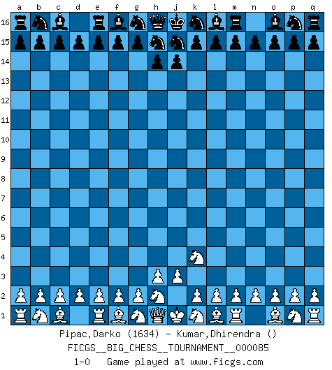 Last move : 1-0 2012 August 31 12:45:53 [Event "FICGS__BIG_CHESS__TOURNAMENT__000085"] [Site "FICGS"] [Date "2012.08.23"] [Round "1"] [White "Pipac,Darko"] [Black "Kumar,Dhirendra"] [Result "1-0"] [WhiteElo "1634"] [BlackElo ""] 1.j2-k4 1-0 Follow this game move after move (download)Different people feel differently about resigning. (Bobby Fischer) Ich habe die Schachforschung dermaßen betrieben, dass sie auf eine wissenschaftliche Basis gestellt wurde. (Mikhail Moiseyevich Botvinik) El Ajedrez no es una pizca de inferior al violín, y tenemos un gran número de violinistas profesionales. (Mikhail Botvinnik) La solitude du joueur d'Echecs à l'approche du mat est semblable à celle du condamné. (Francis Szpiner) Wawaweewa ! (Borat: Cultural learnings of America for make benefit glorious nation of Kazakhstan)