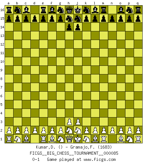 Last move : 0-1 2012 August 31 12:52:18 [Event "FICGS__BIG_CHESS__TOURNAMENT__000085"] [Site "FICGS"] [Date "2012.08.23"] [Round "1"] [White "Kumar,Dhirendra"] [Black "Gramajo,Francisco"] [Result "0-1"] [WhiteElo ""] [BlackElo "1683"] 0-1 Follow this game move after move (download)Chess is a terrific way for kids to build self image and self esteem. (Saudin Robovic) Die Idee von Capablanca, Schach als Fach in den Schulen zu lehren, ist großartig. (Fidel Castro) El estómago es una parte esencial del maestro de Ajedrez. (Bent Larsen) Le temps de noter son nom sur la feuille de partie, j'étais déjà en zeitnot ! D'un modeste amateur apparié lors de la première ronde d'un open contre le grand-maître Azmaïparashvili. I know the human being and fish can coexist peacefully. (George W. Bush, Saginaw sept. 29, 2000)