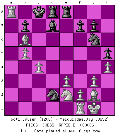 Last move : 1-0 2012 September 6 9:51:2 [Event "FICGS__CHESS__RAPID_E__000086"] [Site "FICGS"] [Date "2012.08.23"] [Round "1"] [White "Goti,Javier"] [Black "Melquiades,Jay"] [Result "1-0"] [WhiteElo "1200"] [BlackElo "0892"] 1.c4 e5 2.Nc3 c6 3.g3 Nf6 4.Bg2 Bb4 5.Qc2 Na6 6.e3 Nc5 7.Nge2 d5 8.cxd5 cxd5 9.a3 d4 10.axb4 Ne6 11.Qd3 dxc3 12.Qxd8+ Nxd8 13.bxc3 a5 14.d3 Nc6 15.b5 Ne7 16.Ba3 Bd7 17.c4 Ng6 18.O-O h5 19.h4 O-O-O 20.Bc5 Rhe8 21.Bb6 e4 22.dxe4 Nxe4 23.Rxa5 Nd2 24.Ra8+ 1-0 English Opening Kingside Castling by player White (move 18) Queenside Castling by player Black (move 19) Player White won this chess game. Follow this game move after move (download)You have to have the fighting spirit. You have to force moves and take chances. (Bobby Fischer) Es hat in meinem Leben Zeiten gegeben, in denen das Schachspiel, wenn nicht zum Lebenszweck, so doch zu einem regelrechten Lebensersatz geworden ist. Man fühlt sich in solchen Zeiten nicht so, als besäße man eine göttliche Gabe, sondern eher so, als sei man von ihr besessen. (Garry Kasparov) Una compensación adecuada por un sacrificio es tener una combinación sólida que conduce a una posición ganadora; una compensación adecuada por una metida de pata es dejar a tu oponente arrebatar una derrota de las fauces de la victoria. (Bruce A. Moon) Si rien de grave n'est détecté lors de l'analyse d'une position, on joue alors le coup. Seconde règle de Blumenfeld. Have no fear of perfection - you'll never reach it. (Salvador Dali)