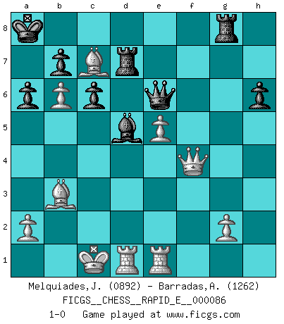 Last move : 1-0 2012 August 26 3:18:6 [Event "FICGS__CHESS__RAPID_E__000086"] [Site "FICGS"] [Date "2012.08.23"] [Round "1"] [White "Melquiades,Jay"] [Black "Barradas,Anderson"] [Result "1-0"] [WhiteElo "0892"] [BlackElo "1262"] 1.e4 e5 2.Nf3 Nc6 3.d4 exd4 4.Nxd4 Nxd4 5.Qxd4 a6 6.Nc3 d6 7.h4 h6 8.b4 Be7 9.Qxg7 Bf6 10.Qg3 c6 11.Bb2 Be5 12.f4 Bf6 13.Bc4 Qe7 14.e5 d5 15.Bb3 Be6 16.O-O-O Bxe5 17.fxe5 f6 18.Rhe1 f5 19.Ne2 O-O-O 20.Nf4 Kb8 21.Ng6 Qg7 22.h5 Ne7 23.c4 Nxg6 24.hxg6 Rhf8 25.Ba3 f4 26.Qh4 Qxg6 27.cxd5 Bxd5 28.b5 Rg8 29.Bd6+ Ka8 30.Bc7 Rd7 31.b6 Qe6 32.Qxf4 1-0 Scotch game Queenside Castling by player White (move 16) Queenside Castling by player Black (move 19) Player White won this chess game. Follow this game move after move (download)The hallmark of the artist is simplicity. (Larry Evans) Ein Gewinn durch eine ungenaue Kombination, sei sie auch noch so vorzeigbar, erfüllt mich mit Schaudern. (Wilhelm Steinitz) El jugador blanco perdió porque fallo en recordar la coreccta continuación y tuvo que pensar por sí mismo las movidas. (Siegbert Tarrasch) Je menace de comprendre la position. (Anonyme) The ultimate in disposing one's troops is to be without ascertainable shape. Then the most penetrating spies cannot pry in nor can the wise lay plans against you. (Sun Tzu)