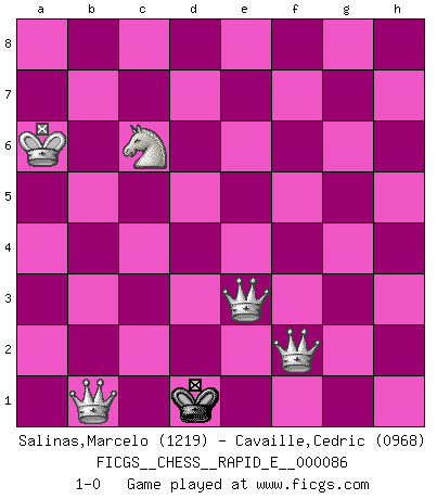Last move : 1-0 2012 November 12 23:19:6 [Event "FICGS__CHESS__RAPID_E__000086"] [Site "FICGS"] [Date "2012.08.23"] [Round "1"] [White "Salinas,Marcelo"] [Black "Cavaille,Cedric"] [Result "1-0"] [WhiteElo "1219"] [BlackElo "0968"] 1.e4 g6 2.Nc3 Bg7 3.Nf3 d6 4.Bb5+ Bd7 5.Qe2 Nf6 6.Bxd7+ Nbxd7 7.Nd5 e5 8.Qc4 c6 9.Nxf6+ Nxf6 10.d4 exd4 11.Qxd4 O-O 12.Bg5 a6 13.O-O-O d5 14.e5 h6 15.Bxf6 Bxf6 16.exf6 Re8 17.Rhe1 Qd6 18.Rxe8+ Rxe8 19.Re1 Rxe1+ 20.Nxe1 g5 21.Nf3 Kh7 22.Qd3+ Kg8 23.Qf5 Qf4+ 24.Qxf4 gxf4 25.Ne5 Kh7 26.h4 h5 27.g4 hxg4 28.Nxg4 Kg6 29.f3 Kh5 30.c3 Kxh4 31.Kd2 c5 32.a4 d4 33.Kd3 Kg3 34.Ne5 b5 35.axb5 axb5 36.cxd4 cxd4 37.Kxd4 Kh4 38.Nxf7 Kg3 39.Ne5 Kf2 40.f7 Ke2 41.f8Q Kd2 42.b4 Kc2 43.Qxf4 Kb3 44.Kc5 Ka4 45.Nc6 Kb3 46.Kxb5 Kc3 47.Qe3+ Kc2 48.f4 Kb2 49.f5 Kc2 50.f6 Kd1 51.f7 Kc2 52.f8Q Kb2 53.Ka6 Kc2 54.b5 Kb2 55.b6 Kc2 56.b7 Kb2 57.b8Q+ Kc2 58.Qf8f2+ Kd1 59.Qb1+ 1-0 Robatsch (Modern) defense Kingside Castling by player Black (move 11) Queenside Castling by player White (move 13) 10 pieces endgame at move 36 : White KNPPP , Black KPPPP WHITE : King + 1 Knight 3 Pawns BLACK : King + 4 Pawns 9 pieces endgame at move 37 : White KNPPP , Black KPPP WHITE : King + 1 Knight 3 Pawns BLACK : King + 3 Pawns 8 pieces endgame at move 38 : White KNPPP , Black KPP WHITE : King + 1 Knight 3 Pawns BLACK : King + 2 Pawns Promotion Queen by player White (move 41) 7 pieces endgame at move 43 : White KQNPP , Black KP WHITE : King + 1 Queen 1 Knight 2 Pawns BLACK : King + 1 Pawn 6 pieces endgame at move 46 : White KQNPP , Black K WHITE : King + 1 Queen 1 Knight 2 Pawns BLACK : King + Promotion Queen by player White (move 52) Promotion Queen by player White (move 57) Player White won this chess game. Follow this game move after move (download)The older I grow, the more I value Pawns. (Keres) Ich brauche nur einen Blick auf das Schachbrett zu werfen, und weiß schon, was in der Stellung steckt, was geschehen kann und was geschehen wird. Alle übrigen suchen und prüfen, ich aber weiß es! (José Raúl Capablanca) Estaba muy claro de que el punto vulnerable del Gran Maestro Americano (Bobby Fischer) radicaba en las posiciones de doble filo, colgantes, irracionales, donde el siempre falló en encontrar un triunfo aún en una posición de clara victoria. (Efim Geller) Le joueur d'Echecs qui veut atteindre le top est obligé de développer son propre credo créatif. Alexeï Stepanovicth Souétine. Il est facile d'écrire des livres ! Ce qui est difficile, c'est de jouer ! (Alexeï Stepanovicth Souétine) A government big enough to give you everything you want is strong enough to take everything you have. (Thomas Jefferson)
