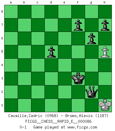 Last move : 0-1 2012 August 24 15:48:15 [Event "FICGS__CHESS__RAPID_E__000086"] [Site "FICGS"] [Date "2012.08.23"] [Round "1"] [White "Cavaille,Cedric"] [Black "Bromo,Alexis"] [Result "0-1"] [WhiteElo "0968"] [BlackElo "1187"] 1.e4 c6 2.Nf3 d5 3.exd5 cxd5 4.d4 Bf5 5.Nc3 Nf6 6.b4 e6 7.a3 a6 8.Bd3 Bd6 9.Bxf5 exf5 10.O-O O-O 11.Bd2 Ne4 12.Qc1 Nd7 13.Bf4 Ndf6 14.Bxd6 Qxd6 15.Nxe4 fxe4 16.Ne5 Rfe8 17.c3 b5 18.f3 exf3 19.Rxf3 Qb6 20.Qg5 Re6 21.Rg3 g6 22.Rf3 Ne4 23.a4 Nxg5 24.Nd7 Qd8 25.Ne5 Nxf3+ 26.Nxf3 Qf6 27.axb5 Rc8 28.bxa6 Rxc3 29.a7 Ra6 30.a8Q+ Rxa8 31.Rxa8+ Kg7 32.Ra1 Rxf3 33.gxf3 Qxd4+ 34.Kf1 Qxa1+ 35.Kg2 Kf6 36.f4 Kf5 37.Kg3 Qf1 38.b5 Qxf4+ 39.Kg2 Qe3 40.b6 Qxb6 41.Kg3 Qe3+ 42.Kg2 Kg4 43.h3+ Kf4 44.h4 Qf3+ 45.Kh2 Qg3+ 46.Kh1 Kf3 47.h5 Qg2+ 0-1 Caro-Kann defense Kingside Castling by player White (move 10) Kingside Castling by player Black (move 10) Promotion Queen by player White (move 30) 10 pieces endgame at move 34 : White KPPP , Black KQPPPP WHITE : King + 3 Pawns BLACK : King + 1 Queen 4 Pawns 9 pieces endgame at move 38 : White KPP , Black KQPPPP WHITE : King + 2 Pawns BLACK : King + 1 Queen 4 Pawns 8 pieces endgame at move 40 : White KP , Black KQPPPP WHITE : King + 1 Pawn BLACK : King + 1 Queen 4 Pawns Player Black won this chess game. Follow this game move after move (download)War is the child of passion, passion is the child of narcissism and narcissism is the child. (...) Another game ? (Thibault de Vassal) Meine Liebe ist Schach, Schach, Schach. Ich muss jeden Tag Schach spielen, deshalb fühle ich mich so stark. (Miguel Najdorf) No soy una persona materialista y por eso, no resiento la falta o pérdida del dinero. La ausencia de cosas mundanas carece de importancia. Ya que el Ajedrez es una forma en la que puedo ser tan materialista como yo desee sin tener la necesidad de vender mi alma. (Jamie Walter Adams) L'attaque fait le spectacle, la défense gagne les matchs. (Dicton footballistique) Gambling is the son of avarice and the father of despair. (French proverb)