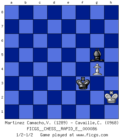 Last move : 1/2-1/2 2012 October 5 17:1:50 [Event "FICGS__CHESS__RAPID_E__000086"] [Site "FICGS"] [Date "2012.08.23"] [Round "1"] [White "Martinez Camacho,Victor Hugo"] [Black "Cavaille,Cedric"] [Result "1/2-1/2"] [WhiteElo "1289"] [BlackElo "0968"] 1.d4 Nf6 2.Nc3 g6 3.e4 d6 4.Nf3 Bg7 5.Be2 O-O 6.O-O c6 7.Be3 Nbd7 8.Qd2 Ng4 9.Bf4 b5 10.a3 a5 11.h3 Ngf6 12.e5 dxe5 13.Nxe5 Nxe5 14.dxe5 Nd5 15.Nxd5 Qxd5 16.Qxd5 cxd5 17.Bxb5 Ba6 18.Bxa6 Rxa6 19.Rad1 e6 20.Rd3 Rc8 21.c3 h5 22.Rfd1 Rb6 23.R3d2 Rcb8 24.b4 axb4 25.axb4 Rc8 26.Rd3 Rbc6 27.b5 Rb6 28.Rb1 Rc5 29.Be3 R6xb5 30.Rxb5 Rxb5 31.f4 f6 32.exf6 Bxf6 33.Kh2 e5 34.fxe5 Bxe5+ 35.g3 Rb3 36.Bd2 Rb5 37.Kg2 Kf7 38.g4 hxg4 39.hxg4 Kf6 40.Rf3+ Ke6 41.Kh3 d4 42.cxd4 Bxd4 43.Rd3 Ke5 44.Kg3 Ke4 45.Ra3 g5 46.Bc1 Rc5 47.Bd2 Be5+ 48.Kh3 Bf4 49.Bb4 Rd5 50.Rb3 Rd3+ 51.Rxd3 Kxd3 52.Bc5 Ke4 53.Bf2 Kf3 54.Bb6 Bg3 55.Ba7 Bh4 56.Bb6 Bf2 57.Bd8 Bh4 58.Bxg5 Bxg5 59.Kh2 1/2-1/2 Queen's pawn game Kingside Castling by player Black (move 5) Kingside Castling by player White (move 6) 10 pieces endgame at move 39 : White KRBPP , Black KRBPP WHITE : King + 1 Rook 1 Bishop 2 Pawns BLACK : King + 1 Rook 1 Bishop 2 Pawns 9 pieces endgame at move 42 : White KRBPP , Black KRBP WHITE : King + 1 Rook 1 Bishop 2 Pawns BLACK : King + 1 Rook 1 Bishop 1 Pawn 8 pieces endgame at move 42 : White KRBP , Black KRBP WHITE : King + 1 Rook 1 Bishop 1 Pawn BLACK : King + 1 Rook 1 Bishop 1 Pawn 7 pieces endgame at move 51 : White KRBP , Black KBP WHITE : King + 1 Rook 1 Bishop 1 Pawn BLACK : King + 1 Bishop 1 Pawn 6 pieces endgame at move 51 : White KBP , Black KBP WHITE : King + 1 Bishop 1 Pawn BLACK : King + 1 Bishop 1 Pawn 5 pieces endgame at move 58 : White KBP , Black KB WHITE : King + 1 Bishop 1 Pawn BLACK : King + 1 Bishop 4 pieces endgame at move 58 : White KP , Black KB WHITE : King + 1 Pawn BLACK : King + 1 Bishop This chess game ended in a draw. Follow this game move after move (download)Chess is no whit inferior to the violin, and we have a large number of professional violinists. (Mikhail Botvinnik) Gewöhnliche Menschen denken nur daran, wie sie ihre Zeit verbringen. Ein intelligenter Mensch versucht, sie auszunutzen. (Arthur Schopenhauer) En el Ajedrez, tal como es jugado por los Maestros, practicamente la suerte es eliminada. (Emanuel Lasker) Celui qui prend des risques peut perdre, celui qui n'en prend pas perd toujours. (Xavier Tartacover) Programmer - an organism that turns coffee into software. (Anonymous)