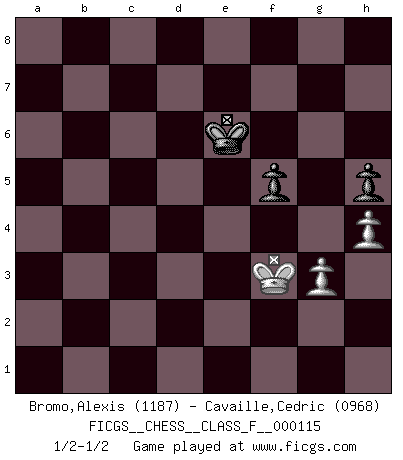 Last move : 1/2-1/2 2012 August 25 17:20:43 [Event "FICGS__CHESS__CLASS_F__000115"] [Site "FICGS"] [Date "2012.08.24"] [Round "1"] [White "Bromo,Alexis"] [Black "Cavaille,Cedric"] [Result "1/2-1/2"] [WhiteElo "1187"] [BlackElo "0968"] 1.d4 g6 2.c4 d6 3.Nc3 Bg7 4.e3 e5 5.d5 c6 6.e4 Nf6 7.h3 cxd5 8.cxd5 O-O 9.Nf3 a6 10.a3 b5 11.b4 Nbd7 12.Bg5 Qc7 13.Rc1 Qb6 14.Be2 a5 15.Nxb5 axb4 16.a4 Nc5 17.Ra1 Ba6 18.a5 Qb7 19.Nxd6 Bxe2 20.Qxe2 Qb8 21.Nc4 Nfxe4 22.Be7 Rc8 23.Bxc5 Nxc5 24.Nb6 Nb3 25.Rb1 Rxa5 26.Nxc8 Qxc8 27.Rxb3 Qc5 28.O-O Ra3 29.Rxa3 bxa3 30.Rd1 Qa5 31.d6 a2 32.Kh2 a1Q 33.Rxa1 Qxa1 34.d7 Bf6 35.Qd2 Qa8 36.Nxe5 Kf8 37.Ng4 Ke7 38.Nxf6 Qd8 39.Qg5 h5 40.Ng8+ Kxd7 41.Nf6+ Ke6 42.Ne4 Qxg5 43.Nxg5+ Kf6 44.Nxf7 Kxf7 45.Kg3 Kf6 46.f4 Kf5 47.h4 Kf6 48.Kf3 Kf5 49.g3 Kf6 50.Ke4 Ke6 51.Kf3 Kf5 52.Ke3 Kf6 53.Ke4 Ke6 54.f5+ gxf5+ 55.Kf4 Kf6 56.Kf3 Ke6 1/2-1/2 Modern defense Kingside Castling by player Black (move 8) Kingside Castling by player White (move 28) Promotion Queen by player Black (move 32) 10 pieces endgame at move 42 : White KNPPP , Black KQPPP WHITE : King + 1 Knight 3 Pawns BLACK : King + 1 Queen 3 Pawns 9 pieces endgame at move 43 : White KNPPP , Black KPPP WHITE : King + 1 Knight 3 Pawns BLACK : King + 3 Pawns 8 pieces endgame at move 44 : White KNPPP , Black KPP WHITE : King + 1 Knight 3 Pawns BLACK : King + 2 Pawns 7 pieces endgame at move 44 : White KPPP , Black KPP WHITE : King + 3 Pawns BLACK : King + 2 Pawns 6 pieces endgame at move 54 : White KPP , Black KPP WHITE : King + 2 Pawns BLACK : King + 2 Pawns This chess game ended in a draw. Follow this game move after move (download)The isolated Pawn casts gloom over the entire chessboard. (Aaron Nimzovich) Wir können eben der zündenden Macht des Opfers nicht wiederstehen, denn die Begeisterung für das Opfer liegt in der Natur des Menschen. (Rudolf Spielmann) El Ajedrez es un juego terrible. Si no dominas el centro, tu oponente tiene una posición mas libre. Si tu tienes el centro, entonces realmente tienes algo de que preocuparte. (Siegbert Tarrasch) Demandez au pauvre Cg1 ce qu'il en pense. Eduard Gufeld à propos de la variante Saemisch de l'Est-Indienne. Chess, like love, like music, has the power to make people happy. (Siegbert Tarrasch)