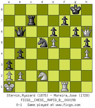 Last move : 0-1 2012 October 21 14:10:53 [Event "FICGS__CHESS__RAPID_B__000198"] [Site "FICGS"] [Date "2012.08.25"] [Round "1"] [White "Sternik,Ryszard"] [Black "Moreira,Jose"] [Result "0-1"] [WhiteElo "1875"] [BlackElo "1728"] 1.e4 c5 2.Nf3 d6 3.d4 cxd4 4.Nxd4 Nf6 5.Nc3 a6 6.Bg5 e6 7.f4 Qb6 8.Nb3 Be7 9.Qf3 Nbd7 10.O-O-O Qc7 11.Kb1 b5 12.Bd3 b4 13.Ne2 Bb7 14.Ned4 Nc5 15.Rhe1 O-O 16.g4 Nxd3 17.Qxd3 Nxg4 18.Bxe7 Qxe7 19.Rg1 Nf6 20.e5 dxe5 21.fxe5 Nd5 22.Qg3 g6 23.Na5 Rac8 24.Nxb7 Qxb7 25.h4 h6 26.Rd3 Qb6 27.Qf2 Rfd8 28.Ka1 Rd7 29.Qd2 h5 30.Rf1 a5 31.Qh6 a4 32.Nf3 Rxc2 33.Ng5 Rf2 34.Rf3 Rxf3 35.Nxf3 Rc7 36.Nd2 a3 0-1 Sicilian : Najdorf, 7...Qb6 Queenside Castling by player White (move 10) Kingside Castling by player Black (move 15) Player Black won this chess game. Follow this game move after move (download)No Chess Grandmaster is normal; they only differ in the extent of their madness. (Viktor Korchnoi) Das Schach ist nichts für kleine Geister, es beansprucht einen vollen Mann, der sich nicht sklavisch an das Überlieferte hält, sondern selbständig die Tiefen des Spiels zu ergründen sucht. (Wilhelm Steinitz) Cualquier cambio de material en una posición debe venir por medio de un mate, una captura o promoción de Peón. (Purdy) La vie est comme un jeu d'échecs : nous esquissons un plan, mais celui-ci est tributaire de ce que daignent faire l'adversaire aux échecs et le destin dans la vie. (Arthur Schopenhauer) All battles are fought by scared men who'd rather be someplace else. (John Wayne in the movie In harm's way)
