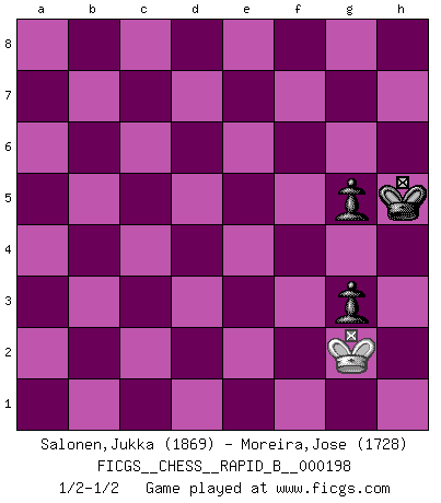 Last move : 1/2-1/2 2012 October 3 16:36:27 [Event "FICGS__CHESS__RAPID_B__000198"] [Site "FICGS"] [Date "2012.08.25"] [Round "1"] [White "Salonen,Jukka"] [Black "Moreira,Jose"] [Result "1/2-1/2"] [WhiteElo "1869"] [BlackElo "1728"] 1.e4 c5 2.Nf3 d6 3.d4 cxd4 4.Nxd4 Nf6 5.Nc3 a6 6.Bg5 e6 7.Qf3 h6 8.Be3 e5 9.Nb3 Be7 10.Be2 O-O 11.Qg3 Kh8 12.O-O b5 13.Rad1 Nbd7 14.f4 Qc7 15.a3 Bb7 16.Bf3 Rac8 17.Rfe1 Ba8 18.Qf2 Rg8 19.h3 Rge8 20.Re2 exf4 21.Bxf4 Ne5 22.Nd4 Nc4 23.Bc1 Nxa3 24.Nd5 Bxd5 25.exd5 Nc4 26.Nc6 Ne5 27.Bf4 Bf8 28.Bxe5 dxe5 29.Rde1 Bd6 30.Be4 a5 31.c3 a4 32.Qf5 Ra8 33.Bb1 Kg8 34.Nxe5 Qc5+ 35.Kf1 Bxe5 36.Rxe5 Kf8 37.d6 Qxd6 38.Qd3 Qxd3+ 39.Bxd3 Rxe5 40.Rxe5 a3 41.bxa3 Rxa3 42.Rxb5 Rxc3 43.Ke2 Nd7 44.Bf5 Ke8 45.Bxd7+ Kxd7 46.Rb7+ Ke6 47.Rb6+ Kf5 48.Rb5+ Kg6 49.Rb4 f5 50.h4 Rg3 51.Kf2 Rg4 52.Rb6+ Kh5 53.g3 f4 54.Rb5+ g5 55.hxg5 fxg3+ 56.Kg2 Rxg5 57.Rxg5+ hxg5 1/2-1/2 Sicilian : Najdorf, 6...e6 Kingside Castling by player Black (move 10) Kingside Castling by player White (move 12) 10 pieces endgame at move 45 : White KRBPP , Black KRPPP WHITE : King + 1 Rook 1 Bishop 2 Pawns BLACK : King + 1 Rook 3 Pawns 9 pieces endgame at move 45 : White KRPP , Black KRPPP WHITE : King + 1 Rook 2 Pawns BLACK : King + 1 Rook 3 Pawns 8 pieces endgame at move 55 : White KRPP , Black KRPP WHITE : King + 1 Rook 2 Pawns BLACK : King + 1 Rook 2 Pawns 7 pieces endgame at move 55 : White KRP , Black KRPP WHITE : King + 1 Rook 1 Pawn BLACK : King + 1 Rook 2 Pawns 6 pieces endgame at move 56 : White KR , Black KRPP WHITE : King + 1 Rook BLACK : King + 1 Rook 2 Pawns 5 pieces endgame at move 57 : White KR , Black KPP WHITE : King + 1 Rook BLACK : King + 2 Pawns 4 pieces endgame at move 57 : White K , Black KPP WHITE : King + BLACK : King + 2 Pawns This chess game ended in a draw. Follow this game move after move (download)The older I grow, the more I value Pawns. (Keres) Die jungen Leute sollen verstehen, dass sie noch etwas von mir lernen können und müssen. (Viktor Kortschnoi) El jugador de combinación piensa hacia adelante; comienza de la posición dada y trabaja las movidas contundentes en su mente. (Emanuel Lasker) Le jeu d'échecs est comme rejeté hors du temps. (Antoine de Saint-Exupéry) When you've done things right people won't know you've done anything at all. (Futurama)