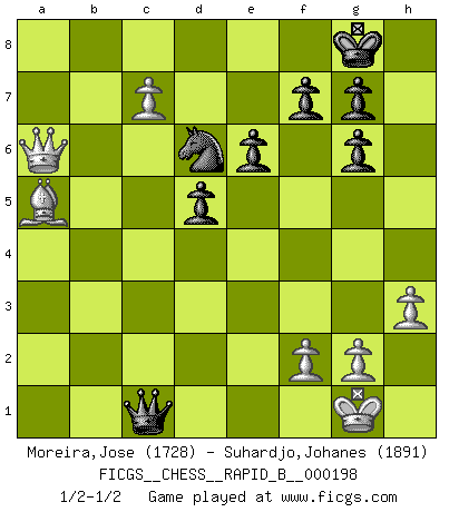 Last move : 1/2-1/2 2012 November 14 2:56:12 [Event "FICGS__CHESS__RAPID_B__000198"] [Site "FICGS"] [Date "2012.08.25"] [Round "1"] [White "Moreira,Jose"] [Black "Suhardjo,Johanes"] [Result "1/2-1/2"] [WhiteElo "1728"] [BlackElo "1891"] 1.e4 c6 2.Nf3 d5 3.e5 Bf5 4.d4 e6 5.Be2 Nd7 6.O-O Bg6 7.c3 Ne7 8.Nh4 c5 9.Nxg6 hxg6 10.Nd2 cxd4 11.cxd4 Qb6 12.Nf3 Nc6 13.a3 Rc8 14.b4 a6 15.Be3 Be7 16.Qd3 Rc7 17.Nd2 Qa7 18.Nb3 b5 19.Nc5 Nb6 20.Bg4 Bxc5 21.bxc5 Nc4 22.Bg5 Rc8 23.h3 Qc7 24.Rab1 O-O 25.Ra1 a5 26.Rfb1 b4 27.axb4 axb4 28.Bd1 Na3 29.Rb2 Ra8 30.Bb3 Nb5 31.Rxa8 Rxa8 32.Qxb5 Nxd4 33.Qf1 Qxe5 34.Bc1 Ra1 35.Ba2 Nb5 36.Rxb4 Nc3 37.Bb1 Rxb1 38.Rxb1 Nxb1 39.c6 Nc3 40.Bd2 Ne4 41.Ba5 Qb2 42.c7 Nd6 43.Qa6 Qc1+ 44.Kh2 Qf4+ 45.Kg1 Qc1+ 46.Kh2 Qf4+ 47.Kg1 Qc1+ 1/2-1/2 Caro-Kann defense Kingside Castling by player White (move 6) Kingside Castling by player Black (move 24) This chess game ended in a draw. Follow this game move after move (download)I give 98 percent of my mental energy to Chess. Others give only 2 percent. (Bobby Fischer) Wie bekannt hörte Morphy 1859 auf, Schach zu spielen. Seine Enttäuschung galt nicht so sehr dem Schach, wie den Schachspielern. (Robert James Fischer) Diferente gente reacciona diferentemente en aceptar la derrota. (Bobby Fischer) Mais n'est-ce pas déjà le limiter injurieusement que d'appeler les échecs un jeu? N'est-ce pas aussi une science, un art, ou quelque chose qui, comme le cercueil de Mahomet entre ciel et terre, est suspendu entre l'un et l'autre, et qui réunit un nombre incroyable de contraires ? (Stefan Zweig) I have opinions of my own - strong opinions - but I don't always agree with them. (George Bush)