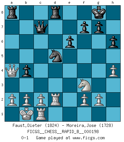 Last move : 0-1 2012 September 20 10:15:8 [Event "FICGS__CHESS__RAPID_B__000198"] [Site "FICGS"] [Date "2012.08.25"] [Round "1"] [White "Faust,Dieter"] [Black "Moreira,Jose"] [Result "0-1"] [WhiteElo "1824"] [BlackElo "1728"] 1.d4 Nf6 2.Nc3 d5 3.Bg5 e6 4.e4 dxe4 5.Nxe4 Be7 6.Bxf6 Bxf6 7.Nf3 O-O 8.Qd2 b6 9.O-O-O Bb7 10.Bd3 h6 11.Qf4 Nd7 12.Bc4 Qb8 13.d5 b5 14.Bb3 c5 15.Qd6 Rd8 16.Nxf6+ Nxf6 17.Qxc5 Bxd5 18.Bxd5 Nxd5 19.Rhe1 Qf4+ 20.Kb1 Rac8 21.Qa3 Qc7 22.Rd2 a5 23.h4 a4 24.Rc1 b4 25.Qxa4 Ra8 0-1 Queen's pawn game Kingside Castling by player Black (move 7) Queenside Castling by player White (move 9) Player Black won this chess game. Follow this game move after move (download)Though most people love to look at the games of the great attacking masters, some of the most successful players in history have been the quiet positional players. They slowly grind you down by taking away your space, tying up your pieces, and leaving you with virtually nothing to do ! (Yasser Seirawan) Jeder leidlich begabte Spieler, er braucht keineswegs hervorragend veranlagt zu sein, kann es zum Meister bringen. Aber das ist ja auch gar nicht nötig! Der richtige Standpunkt ist es, zu seinem Vergnügen zu spielen, und man glaube ja nicht, dass der Genuss proportional dem Können sei. (Siegbert Tarrasch) Coloca el contenido de las piezas del Ajedrez en un sombrero, agitalo vigorosamente, arrojalas en un tablero desde una altura de 30 centimetros y así obtendras el estilo de Steinitz. (H. E. Bird) Vous m'avez demandé de vous exposer quel est le fondement de la prière. Je ne fais que préparer les pièces du jeu sur la table... Nous sera-t-il permis d'en adopter les règles et si nous les appliquons scrupuleusement nous ne tarderons pas à faire mat le Roi divin ! Il ne pourra échapper à nos mains. (Sainte Thérèse d'Avila, Chemin de perfection) Do not put your faith in what statistics say until you have carefully considered what they do not say. (William W. Watt)