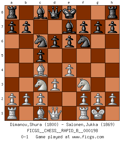 Last move : 0-1 2012 October 4 9:17:38 [Event "FICGS__CHESS__RAPID_B__000198"] [Site "FICGS"] [Date "2012.08.25"] [Round "1"] [White "Dimanov,Shura"] [Black "Salonen,Jukka"] [Result "0-1"] [WhiteElo "1800"] [BlackElo "1869"] 1.e4 c5 2.Nf3 d6 3.Bc4 Nf6 4.d3 e6 5.Nc3 Nc6 6.O-O Be7 0-1 This chess game has been lost on time (started : 2012.08.25 16:14:45) Sicilian Kingside Castling by player White (move 6) Player Black won this chess game. Follow this game move after move (download)If your opponent offers you a draw, try to work out why he thinks he's worse off. (Nigel Short) Schach ist ein Teil der Kultur, und wenn es mit der Kultur abwärts geht, geht es auch mit dem Schach abwärts. (Mikhail Moiseyevich Botvinik) El Ajedrez es un expediente tonto que hace creer a la gente inactiva que hacen una cosa muy astuta cuando solamente estan perdiendo su tiempo. (George Bernard Shaw) On entre au jeu d'Echecs comme on entre en Religion. Pour le joueur d'Echecs, la partie d'Echecs c'est l'office, la messe, le défilé du 1er Mai, le dépôt de gerbe au Monument aux Morts. C'est un drame sacré. (Michel Roos) If computers get too powerful, we can organize them into committees. That'll do them in. (Anonymous)
