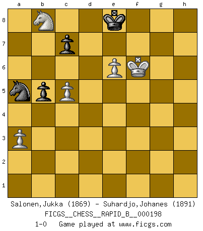 Last move : 1-0 2012 December 7 1:28:24 [Event "FICGS__CHESS__RAPID_B__000198"] [Site "FICGS"] [Date "2012.08.25"] [Round "1"] [White "Salonen,Jukka"] [Black "Suhardjo,Johanes"] [Result "1-0"] [WhiteElo "1869"] [BlackElo "1891"] 1.e4 e5 2.Nf3 Nc6 3.Bb5 Nf6 4.O-O Nxe4 5.d4 Nd6 6.Bxc6 dxc6 7.dxe5 Nf5 8.Qxd8+ Kxd8 9.Nc3 Be6 10.Rd1+ Ke8 11.Ng5 Be7 12.Nxe6 fxe6 13.Ne4 Rd8 14.Rxd8+ Kxd8 15.Bg5 Bxg5 16.Nxg5 Ke7 17.Rd1 h6 18.Ne4 b6 19.c3 Rd8 20.Rxd8 Kxd8 21.f4 Ne3 22.b4 Ng4 23.g3 Ke7 24.Kg2 Kf7 25.Nf2 Ne3+ 26.Kf3 Nd5 27.Nd1 h5 28.Ke4 Ke7 29.a3 b5 30.c4 Nb6 31.Nb2 h4 32.Kd4 hxg3 33.hxg3 Kd7 34.Kc5 a6 35.Kd4 Ke7 36.c5 Nd5 37.Nd3 Kf7 38.Ne1 Ke7 39.Ng2 Kd7 40.Kd3 Ne7 41.Nh4 Ke8 42.g4 g6 43.Ke4 Kf7 44.Nf3 Ke8 45.Nd4 Kd7 46.Ke3 Nd5+ 47.Kf3 Ne7 48.Ke4 Nd5 49.f5 exf5+ 50.gxf5 gxf5+ 51.Kxf5 Ne3+ 52.Kg6 Ng4 53.e6+ Ke7 54.Kg5 Ne5 55.Kf5 Nc4 56.Nxc6+ Ke8 57.Nb8 a5 58.bxa5 Nxa5 59.Kf6 1-0 Ruy Lopez : Berlin defense, Open variation Kingside Castling by player White (move 4) 10 pieces endgame at move 58 : White KNPPPP , Black KNPP WHITE : King + 1 Knight 4 Pawns BLACK : King + 1 Knight 2 Pawns 9 pieces endgame at move 58 : White KNPPP , Black KNPP WHITE : King + 1 Knight 3 Pawns BLACK : King + 1 Knight 2 Pawns Player White won this chess game. Follow this game move after move (download)You may learn much more from a game you lose than from a game you win. You will have to lose hundreds of games before becoming a good player. (Jose Raul Capablanca) Ich verachte die Medien. (Robert James Fischer) En manos de Fischer's, una diminuta ventaja teórica es tan buena como tener una Reina de ventaja. (Isaac Kashdan) Comme les marins qui ont mille raisons différentes d'aller en mer, les joueurs d'échecs en ont tout autant avant de s'installer devant une table et jouer... (Vincent Bertignac, philosophe) Art disturbs, science reassures. (Georges Braque, Le Jour et la Nuit)