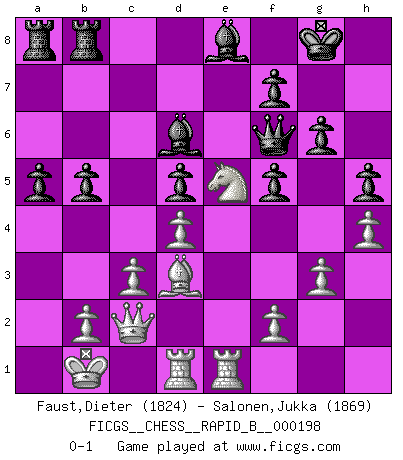 Last move : 0-1 2012 September 18 17:5:1 [Event "FICGS__CHESS__RAPID_B__000198"] [Site "FICGS"] [Date "2012.08.25"] [Round "1"] [White "Faust,Dieter"] [Black "Salonen,Jukka"] [Result "0-1"] [WhiteElo "1824"] [BlackElo "1869"] 1.d4 d5 2.Nc3 Nf6 3.Bg5 h6 4.Bxf6 exf6 5.e3 c6 6.Bd3 Na6 7.a3 Bd6 8.Nf3 f5 9.Ne2 O-O 10.c3 Nc7 11.Qc2 Qf6 12.O-O-O b5 13.Kb1 Bd7 14.Ng3 g6 15.h4 h5 16.Ne2 a5 17.Nf4 Rfb8 18.a4 Ne6 19.axb5 Nxf4 20.exf4 Bxf4 21.g3 Bd6 22.Rhe1 cxb5 23.Ne5 Be8 0-1 Richter-Veresov attack Kingside Castling by player Black (move 9) Queenside Castling by player White (move 12) Player Black won this chess game. Follow this game move after move (download)I had a toothache during the first game. In the second game I had a headache. In the third game it was an attack of rheumatism. In the fourth game, I wasn't feeling well. And in the fifth game? Well, must one have to win every game ? (Siegbert Tarrasch) Über Kasparov: Es ist offensichtlich, daß er in einem totalitären Staat aufwuchs und deshalb zu diktatorischen Zügen neigt. (Viktor Kortschnoi) El Ajedrez no es como la vida... ¡tiene reglas!. (Mark Pasternak) C'est une question de caractère, Beaucoup de gens perdent leur motivation très vite. D'autres, ils sont rares, peuvent la conserver très longtemps. J'aime les échecs, encore aujourd'hui je suis heureux d'analyser des parties. J'aime toujours gagner, je déteste encore perdre. Bien jouer est important pour mon intégrité intellectuelle et morale. Et puis les échecs vivent en ce moment une période historique grâce à Internet. Ils se développent dans les systèmes éducatifs à travers le monde. Ils sortent de leur ghetto, et c'est mon rôle de mener à bien cette révolution. (Gary Kasparov) When a man with money meets a man with experience, the man with experience leaves with money and the man with money leaves with experience. (Anonymous)