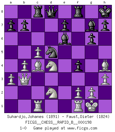Last move : 1-0 2012 October 4 14:14:47 [Event "FICGS__CHESS__RAPID_B__000198"] [Site "FICGS"] [Date "2012.08.25"] [Round "1"] [White "Suhardjo,Johanes"] [Black "Faust,Dieter"] [Result "1-0"] [WhiteElo "1891"] [BlackElo "1824"] 1.d4 f5 2.Nf3 Nf6 3.h3 g6 4.Bf4 Bg7 5.e3 d6 6.Bc4 Nc6 7.Nbd2 Na5 8.Bd3 O-O 9.O-O c5 10.a3 cxd4 11.exd4 Bd7 12.b4 Nc6 13.c3 Kh8 14.Rc1 Nd5 15.Bg3 Rc8 16.c4 Nb6 17.c5 dxc5 18.dxc5 Nd5 19.Qb3 f4 20.Bh4 Be6 21.Bc4 Nd4 22.Nxd4 1-0 Dutch Kingside Castling by player Black (move 8) Kingside Castling by player White (move 9) Player White won this chess game. Follow this game move after move (download)Later, I began to succeed in decisive games. Perhaps because I realized a very simple truth: not only was I worried, but also my opponent. (Mikhail Tal) Ein Kibitz ist einer, der deinem Gegner gute Ratschläge gibt. (Andrew Soltis) El Ajedrez era la lengua materna de Capablanca. (Reti) La victoire dans une partie d'Echecs appartient la plupart du temps à celui qui voit un peu plus loin que l'adversaire. (Lasker) I find television to be very educating. Every time somebody turns on the set, I go in the other room and read a book. (Groucho Marx)