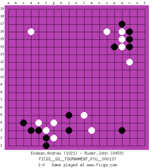Last move : 1-0 2012 October 12 9:50:27 [Event "FICGS__GO__TOURNAMENT_KYU__000137"] [Site "FICGS"] [Date "2012.08.25"] [Round "1"] [Black "Endean,Andrew"] [White "Ruder,John"] [Result "1-0"] [Rating 1 "1021"] [Rating 2 "0459"] 1.q3 q16 2.c4 d16 3.j3 e4 4.e3 f3 5.d3 g4 6.f2 g2 7.f1 m3 8.j5 l5 9.r14 r12 10.p14 o16 11.r16 q15 12.r15 q14 13.q17 1-0 This go game has been lost on time (started : 2012.08.25 16:47:27) Here are the names of the openings (joseki) played in the four corners : Corner q4 : q3 m3 Komoku (Somok, Xiao~mu`) 3-4 Point. The komoku (3-4) point is the traditional corner enclosure move.. Corner q16 : q16 r14 Hoshi (Hwajeom, Seongjeom, Xingwei`) 4-4 Point. The star or hoshi (4-4) point, emphasizing influence at the potential expense of territory. Ikken Kakari (Hankan Keolch'im, Yi Gua`jiao~, 1-Space Low Approach). Black 2 is the standard approach move to the 4-4. Player Black won this Go (weiqi, baduk) game. Follow this game move after move (download)Beginner's games are surprising, often incoherent and incomprehensible. When you improve, your game gains in consistency but flirts with stupidity: you become satisfied with truisms and mechanical movements, you try to obtain a feeling for clearness and style the easy way. (Pierre Audouard) Locking firmely the window serves nothing, only small thiefs pass through there, the big thiefs enter through the front door. (Luc-Olivier Leclerc)