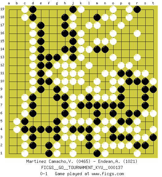 Last move : 0-1 2012 November 28 5:52:23 [Event "FICGS__GO__TOURNAMENT_KYU__000137"] [Site "FICGS"] [Date "2012.08.25"] [Round "1"] [Black "Martinez Camacho,Victor Hugo"] [White "Endean,Andrew"] [Result "0-1"] [Rating 1 "0465"] [Rating 2 "1021"] 1.d4 d17 2.q6 r16 3.k4 k16 4.q11 c6 5.o4 c3 6.c5 b5 7.c4 b4 8.d3 c2 9.d6 c7 10.d7 c8 11.d8 d9 12.e9 d10 13.e10 d11 14.d2 c1 15.e11 k10 16.e16 d16 17.e15 d15 18.e14 d14 19.e13 d13 20.e12 d12 21.j16 j17 22.h16 k15 23.e17 m9 24.j14 k14 25.j13 k13 26.j11 o13 27.k12 l12 28.j9 k11 29.k9 l9 30.l8 m8 31.m7 j10 32.h10 j12 33.h12 h11 34.g11 j11 35.h17 j18 36.h18 k8 37.l7 h9 38.h8 j8 39.g9 g10 40.f10 h10 41.g8 q12 42.p11 p12 43.j15 g12 44.f12 h13 45.g13 f11 46.f13 r11 47.h14 h12 48.r10 s11 49.s10 o11 50.o10 n11 51.n10 m10 52.n9 t10 53.s9 n8 54.n7 o8 55.p8 p10 56.p9 o9 57.q10 o10 58.o7 j7 59.h7 j6 60.h6 j5 61.j4 h5 62.g5 h4 63.g4 h3 64.f4 k5 65.l4 l5 66.t9 r13 67.j19 k19 68.d18 c18 69.d19 c19 70.g3 j3 71.h2 j2 72.h1 j1 73.m5 g2 74.e4 k3 75.f2 g1 76.f1 m4 77.l3 m3 78.l2 m2 79.m1 n1 80.o1 n2 81.o3 o2 82.p1 p2 83.q1 q2 84.r2 r1 85.q3 r3 86.s2 q4 87.p3 r4 88.q5 s3 89.t3 t4 90.k7 n5 91.m6 n4 92.o6 o5 93.p5 p4 94.p7 r5 95.r6 s6 96.s7 t6 97.s8 p17 98.o17 o16 99.p18 o18 100.n17 q18 101.p19 o19 102.r19 q19 103.n16 o15 104.m16 l17 105.l16 m17 106.l15 l14 107.m14 n15 108.n14 m15 109.m18 n18 0-1 Here are the names of the openings (joseki) played in the four corners : Corner q16 : r16 q11 Komoku (Somok, Xiao~mu`) 3-4 Point. The komoku (3-4) point is the traditional corner enclosure move.. Corner d4 : d4 c6 Hoshi (Hwajeom, Seongjeom, Xingwei`) 4-4 Point. The star or hoshi (4-4) point, emphasizing influence at the potential expense of territory. Ikken Kakari (Hankan Keolch'im, Yi Gua`jiao~, 1-Space Low Approach). White 2 is the standard approach move to the 4-4. Player White won this Go (weiqi, baduk) game. Follow this game move after move (download)Win the stones, lose the game. (Anonymous) Hardware: the parts of a computer that can be kicked. (Jeff Persis)