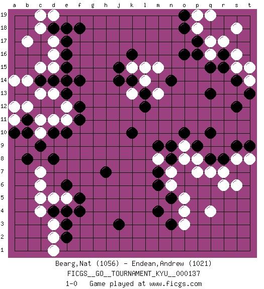 Last move : 1-0 2012 November 23 13:30:8 [Event "FICGS__GO__TOURNAMENT_KYU__000137"] [Site "FICGS"] [Date "2012.08.25"] [Round "1"] [Black "Bearg,Nat"] [White "Endean,Andrew"] [Result "1-0"] [Rating 1 "1056"] [Rating 2 "1021"] 1.f4 d17 2.o16 q4 3.k10 c5 4.d10 d3 5.q8 o3 6.m4 r6 7.e16 d16 8.e15 d15 9.q13 q16 10.r16 r17 11.q15 s16 12.r15 s15 13.p16 q17 14.p17 p18 15.o18 p19 16.k16 s18 17.n3 o4 18.e17 e14 19.d14 d13 20.c14 c15 21.e13 c13 22.f14 b14 23.e14 b12 24.b11 c11 25.b10 c10 26.c9 d11 27.e10 e11 28.f11 e12 29.f12 a11 30.a10 a12 31.b8 a14 32.d18 c18 33.f18 b17 34.d4 c4 35.e3 d5 36.e4 d2 37.e2 d1 38.e6 c7 39.d8 c6 40.j3 n6 41.n5 o5 42.m6 n7 43.n8 o8 44.n9 o9 45.o10 p7 46.p9 p8 47.q10 q7 48.r8 r7 49.m7 m8 50.m9 s8 51.s9 t8 52.t9 s6 53.s14 d19 54.e18 c19 55.o19 q19 56.h7 e5 57.f5 k13 58.l13 l14 59.k14 m13 60.l12 k15 61.j14 m15 62.j15 l15 63.n14 t14 64.t13 t15 65.s12 1-0 Here are the names of the openings (joseki) played in the four corners : Corner d4 : f4 c5 Ootakamoku (Chaogao) 6-4 Point. The large takamoku (high) point (6-4), experimented with during the "new fuseki" movement in Japan in the 1930's. This point is seldom played as the initial corner point nowadays. Corner q4 : q4 q8 Hoshi (Hwajeom, Seongjeom, Xingwei`) 4-4 Point. The star or hoshi (4-4) point, emphasizing influence at the potential expense of territory. Corner d16 : d17 e16 Komoku (Somok, Xiao~mu`) 3-4 Point. The komoku (3-4) point is the traditional corner enclosure move.. Player Black won this Go (weiqi, baduk) game. Follow this game move after move (download)On the third line, four die, six live. (Anonymous) Live, lose, and learn, by observing your opponent how to win. (Amber Steenbock)