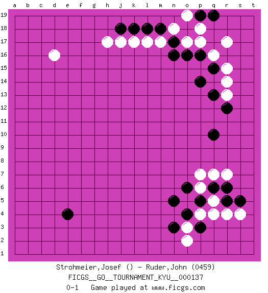 Last move : 0-1 2012 December 3 23:29:15 [Event "FICGS__GO__TOURNAMENT_KYU__000137"] [Site "FICGS"] [Date "2012.08.25"] [Round "1"] [Black "Strohmeier,Josef"] [White "Ruder,John"] [Result "0-1"] [Rating 2 "0459"] 1.e4 d16 2.q10 q16 3.p14 r14 4.o16 p17 5.p16 o17 6.n17 r17 7.q13 r13 8.r12 q4 9.q15 r15 10.o18 p18 11.p19 n18 12.m18 o19 13.q19 m17 14.n16 l17 15.l18 k17 16.k18 j17 17.j18 h17 18.p5 q5 19.q6 p4 20.o4 o5 21.n5 p6 22.o6 q7 23.r6 r7 24.r5 r4 25.p5 p7 26.s5 s4 27.p3 o3 28.n3 o2 0-1 This go game has been lost on time (started : 2012.08.25 16:47:27) Here are the names of the openings (joseki) played in the four corners : Corner q16 : q16 p14 Hoshi (Hwajeom, Seongjeom, Xingwei`) 4-4 Point. The star or hoshi (4-4) point, emphasizing influence at the potential expense of territory. Corner q4 : q4 p5 Hoshi (Hwajeom, Seongjeom, Xingwei`) 4-4 Point. The star or hoshi (4-4) point, emphasizing influence at the potential expense of territory. Player White won this Go (weiqi, baduk) game. Follow this game move after move (download)The saki bottle shape is negative. (Anonymous) Those who make the worst use of their time are the first to complain of its brevity. (Jean de la Bruyere)