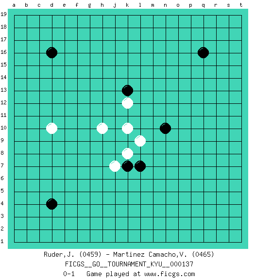 Last move : 0-1 2012 October 6 21:28:56 [Event "FICGS__GO__TOURNAMENT_KYU__000137"] [Site "FICGS"] [Date "2012.08.25"] [Round "1"] [Black "Ruder,John"] [White "Martinez Camacho,Victor Hugo"] [Result "0-1"] [Rating 1 "0459"] [Rating 2 "0465"] 1.n10 h10 2.k7 d10 3.k13 k10 4.d16 k12 5.q16 k8 6.l7 l9 7.d4 j7 0-1 This go game has been lost on time (started : 2012.08.25 16:47:27) Here are the names of the openings (joseki) played in the four corners : Corner q4 : l7 l9 This joseki is unknown. A weak or weird move has probably been played in this corner. Corner d4 : d4 j7 Hoshi (Hwajeom, Seongjeom, Xingwei`) 4-4 Point. The star or hoshi (4-4) point, emphasizing influence at the potential expense of territory. Player White won this Go (weiqi, baduk) game. Follow this game move after move (download)Learn the eye-stealing tesuji. (Anonymous) God, you are such an idiot. - Actually, I thought I was more of a jerk. (Gregory House to Stacy Warner, House M.D.)