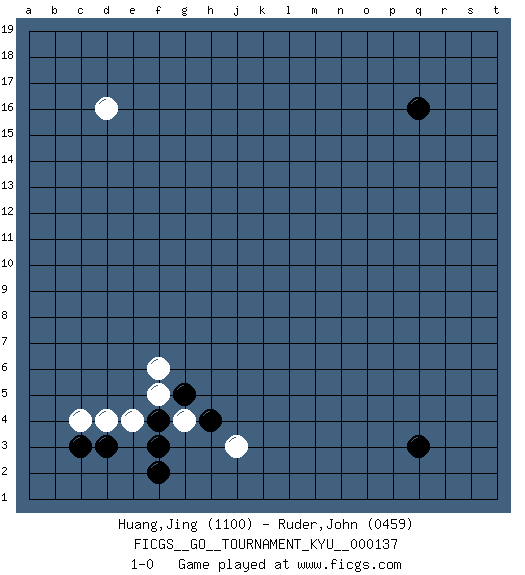 Last move : 1-0 2012 October 12 9:50:27 [Event "FICGS__GO__TOURNAMENT_KYU__000137"] [Site "FICGS"] [Date "2012.08.25"] [Round "1"] [Black "Huang,Jing"] [White "Ruder,John"] [Result "1-0"] [Rating 1 "1100"] [Rating 2 "0459"] 1.q16 d4 2.q3 d16 3.f3 j3 4.c3 c4 5.d3 e4 6.f2 g4 7.f4 f5 8.g5 f6 9.h4 1-0 This go game has been lost on time (started : 2012.08.25 16:47:27) Here are the names of the openings (joseki) played in the four corners : Corner d4 : d4 f3 Hoshi (Hwajeom, Seongjeom, Xingwei`) 4-4 Point. The star or hoshi (4-4) point, emphasizing influence at the potential expense of territory. Ikken Kakari (Hankan Keolch'im, Yi Gua`jiao~, 1-Space Low Approach). Black 2 is the standard approach move to the 4-4. Player Black won this Go (weiqi, baduk) game. Follow this game move after move (download)Eyes win semiais. (Anonymous) There are more things in heaven and earth than practically anywhere else. (Unknown)