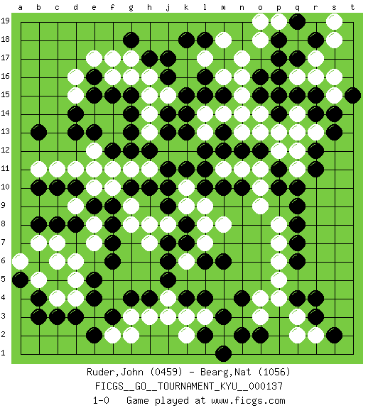 Last move : 1-0 2013 February 7 0:23:35 [Event "FICGS__GO__TOURNAMENT_KYU__000137"] [Site "FICGS"] [Date "2012.08.25"] [Round "1"] [Black "Ruder,John"] [White "Bearg,Nat"] [Result "1-0"] [Rating 1 "0459"] [Rating 2 "1056"] 1.n10 d6 2.g10 o4 3.k7 f16 4.k13 q14 5.e4 d4 6.d3 c4 7.c3 o9 8.e5 d5 9.l4 l3 10.m3 k3 11.n4 f10 12.e9 l14 13.c8 c7 14.d8 e10 15.b6 b7 16.b4 b5 17.a5 c6 18.b3 a6 19.b8 e7 20.f9 e8 21.f6 d9 22.d10 d11 23.c10 g9 24.f8 g11 25.h10 g8 26.f7 h7 27.j5 j4 28.h4 h3 29.k4 j3 30.g4 g3 31.f3 f2 32.e2 m2 33.n2 o3 34.l2 k2 35.m1 g2 36.r4 q3 37.r3 r2 38.s2 q2 39.q4 p4 40.o2 p5 41.q6 p6 42.q7 p7 43.q8 p8 44.p10 o10 45.p11 o11 46.r12 q12 47.r11 q11 48.q10 p12 49.q9 l8 50.o12 o13 51.n12 n11 52.m12 l13 53.l12 k12 54.k11 j12 55.j11 h11 56.j9 k10 57.l10 k9 58.k8 l9 59.j10 k6 60.j6 l7 61.l6 j8 62.j7 h8 63.m10 n13 64.m6 m8 65.j14 j15 66.h12 h13 67.j13 m11 68.l11 h14 69.g12 f11 70.f12 e11 71.d13 c11 72.b13 b11 73.b10 e12 74.e13 f13 75.g13 f14 76.g14 h15 77.f15 e14 78.e15 d16 79.g15 d15 80.d14 g16 81.e16 e17 82.k15 k16 83.l15 m16 84.m15 n15 85.m13 m14 86.k14 n14 87.l16 l17 88.j16 h16 89.j17 k17 90.h17 g17 91.g18 f17 92.m17 n16 93.k18 r17 94.s14 r13 95.s13 s15 96.r15 s16 97.r14 q13 98.q15 p15 99.p14 p13 100.p16 n17 101.l18 m18 102.p17 o18 103.p18 o14 104.o16 q16 105.q17 r16 106.r18 s18 107.o15 l17 108.p14 p19 109.q19 o19 110.p15 s19 111.t15 1-0 Here are the names of the openings (joseki) played in the four corners : Corner d4 : d6 e4 Ootakamoku (Chaogao) 6-4 Point. The large takamoku (high) point (6-4), experimented with during the "new fuseki" movement in Japan in the 1930's. This point is seldom played as the initial corner point nowadays. Player Black won this Go (weiqi, baduk) game. Follow this game move after move (download)It is difficult to know exactly what you are doing. (Pierre Audouard) Luck is what you have left over after you give 100 percent. (Langston Coleman)