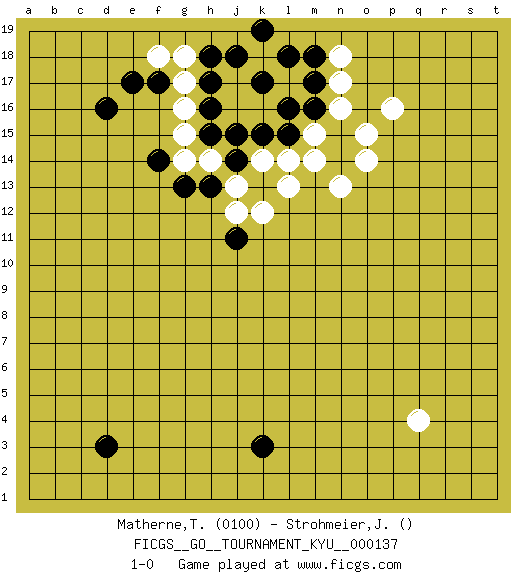 Last move : 1-0 2012 December 4 2:43:34 [Event "FICGS__GO__TOURNAMENT_KYU__000137"] [Site "FICGS"] [Date "2012.08.25"] [Round "1"] [Black "Matherne,Tommie"] [White "Strohmeier,Josef"] [Result "1-0"] [Rating 1 "0100"] 1.d3 p16 2.d16 q4 3.k3 m15 4.k15 k14 5.l15 k16 6.l16 j16 7.j15 l17 8.m16 n16 9.m17 n17 10.m18 n18 11.k17 j17 12.h16 k18 13.n15 m14 14.n14 l14 15.j14 j13 16.h15 h14 17.l18 g15 18.h17 g17 19.h18 g18 20.j18 g16 21.k19 n13 22.k17 o14 23.h13 g14 24.g13 o15 25.k13 j12 26.j11 k12 27.f14 l13 28.f17 f18 29.e17 1-0 Here are the names of the openings (joseki) played in the four corners : Corner d16 : d16 j16 Hoshi (Hwajeom, Seongjeom, Xingwei`) 4-4 Point. The star or hoshi (4-4) point, emphasizing influence at the potential expense of territory. Corner d4 : d3 1-0 Komoku (Somok, Xiao~mu`) 3-4 Point. The komoku (3-4) point is the traditional corner enclosure move.. Player Black won this Go (weiqi, baduk) game. Follow this game move after move (download)The poor player plays the opponent's game for him. (Anonymous) Faith : not wanting to know what is true. (Friedrich Nietzsche)