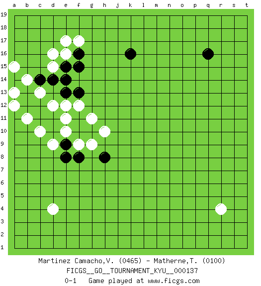 Last move : 0-1 2012 October 2 6:51:14 [Event "FICGS__GO__TOURNAMENT_KYU__000137"] [Site "FICGS"] [Date "2012.08.25"] [Round "1"] [Black "Martinez Camacho,Victor Hugo"] [White "Matherne,Tommie"] [Result "0-1"] [Rating 1 "0465"] [Rating 2 "0100"] 1.q16 d4 2.d14 r4 3.k16 d16 4.f16 e16 5.e15 d15 6.e14 e17 7.f15 f17 8.d10 d9 9.e9 e10 10.f10 e11 11.f11 c10 12.d11 f9 13.e8 e12 14.e13 d12 15.c11 b11 16.c12 c13 17.b12 a12 18.b13 b14 19.f8 g9 20.a14 a13 21.c14 a15 22.h8 f12 23.f13 g11 24.g10 h10 0-1 Here are the names of the openings (joseki) played in the four corners : Corner d16 : d14 d16 Ootakamoku (Chaogao) 6-4 Point. The large takamoku (high) point (6-4), experimented with during the "new fuseki" movement in Japan in the 1930's. This point is seldom played as the initial corner point nowadays. Player White won this Go (weiqi, baduk) game. Follow this game move after move (download)In the corner, five stones in a row on the third line are alive. (Anonymous) When you stop learning you start dying. (M. Scott Adams)