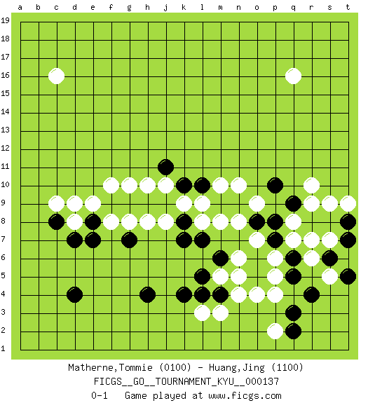 Last move : 0-1 2012 December 13 5:4:19 [Event "FICGS__GO__TOURNAMENT_KYU__000137"] [Site "FICGS"] [Date "2012.08.25"] [Round "1"] [Black "Matherne,Tommie"] [White "Huang,Jing"] [Result "0-1"] [Rating 1 "0100"] [Rating 2 "1100"] 1.d4 q16 2.r4 c16 3.h4 c9 4.c8 d9 5.p10 p4 6.o5 o4 7.n5 n4 8.m4 m3 9.l4 l3 10.k4 p5 11.o6 p6 12.p7 q7 13.q6 q8 14.q5 o7 15.p8 m5 16.m6 n6 17.o8 r10 18.q9 r9 19.l5 n5 20.l7 n8 21.n9 m8 22.r8 r7 23.s8 s7 24.t7 s9 25.t8 t6 26.m9 l8 27.k8 l9 28.l10 k9 29.s6 t9 30.t8 m10 31.t5 n10 32.q3 p2 33.q2 s5 34.t7 r6 35.j9 o9 36.k10 j10 37.j11 h10 38.h9 g10 39.g9 f10 40.f9 e9 41.e8 d8 42.d7 f8 43.e7 j8 44.k7 h8 45.g7 g8 0-1 Here are the names of the openings (joseki) played in the four corners : Corner q4 : r4 p4 Komoku (Somok, Xiao~mu`) 3-4 Point. The komoku (3-4) point is the traditional corner enclosure move.. Ikken Takagakari (Hankan Nop'dakeolch'im, Yi Gaogua`jiao~, 1-Space High Approach). The 5-4 approach move has become more popular in modern times, as modern Go emphasizes speed and influence. Corner d16 : c16 j11 Komoku (Somok, Xiao~mu`) 3-4 Point. The komoku (3-4) point is the traditional corner enclosure move.. Player White won this Go (weiqi, baduk) game. Follow this game move after move (download)A basic: Don't push too hard. (Jansteen) I live to kill Traxler counterattack. (Ilmars Cirulis)