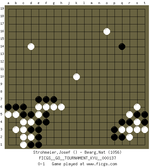 Last move : 0-1 2012 December 21 9:16:54 [Event "FICGS__GO__TOURNAMENT_KYU__000137"] [Site "FICGS"] [Date "2012.08.25"] [Round "1"] [Black "Strohmeier,Josef"] [White "Bearg,Nat"] [Result "0-1"] [Rating 2 "1056"] 1.e4 o16 2.q4 d14 3.q14 d4 4.f4 k10 5.d5 c4 6.d3 c3 7.e3 c2 8.c5 b5 9.b6 a5 10.c6 d2 11.e2 b3 12.a6 q3 13.p3 r3 14.r4 s4 15.s5 s3 16.t4 t3 17.q2 r2 18.p2 r5 19.t5 s6 20.d1 c1 21.e1 e5 22.f5 e6 23.e7 f6 24.f7 g6 25.g7 h6 0-1 Here are the names of the openings (joseki) played in the four corners : Corner q16 : o16 q14 Ootakamoku (Chaogao) 6-4 Point. The large takamoku (high) point (6-4), experimented with during the "new fuseki" movement in Japan in the 1930's. This point is seldom played as the initial corner point nowadays. Corner d4 : e4 d4 Takamoku (Gomok, Gaomu`) 5-4 Point. The takamoku (high) point (5-4). With its emphasis on influence, the 5-4 point complements the 4-4 (hoshi) point in creating an influence-oriented fuseki. Corner q4 : q4 q3 Hoshi (Hwajeom, Seongjeom, Xingwei`) 4-4 Point. The star or hoshi (4-4) point, emphasizing influence at the potential expense of territory. Player White won this Go (weiqi, baduk) game. Follow this game move after move (download)If White takes all four corners, Black should resign; if Black takes all four corners, Black should also resign. (David Kent) The only thing that matters is the evidence. (Horatio Caine, C.S.I. Miami)