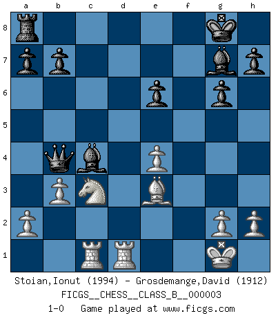 Last move : 1-0 2006 November 18 14:2:58 [Event "FICGS__CHESS__CLASS_B__000003"] [Site "FICGS"] [Date "2006.05.14"] [Round "1"] [White "Stoian,Ionut"] [Black "Grosdemange,David"] [Result "1-0"] [WhiteElo "1994"] [BlackElo "1912"] 1.e4 c5 2.Nf3 g6 3.d4 cxd4 4.Nxd4 Nc6 5.c4 Nf6 6.Nc3 d6 7.f3 Nxd4 8.Qxd4 Bg7 9.Be3 O-O 10.Qd2 Be6 11.Bd3 Nd7 12.O-O Ne5 13.Be2 Nxc4 14.Bxc4 Bxc4 15.Rfd1 f5 16.Rac1 fxe4 17.fxe4 e6 18.Qxd6 Rf1+ 19.Rxf1 Qxd6 20.Rfd1 Qb4 21.b3 1-0 This chess game has been lost on time (started : 2006.05.14 11:15:1) Sicilian : Hungarian variation Kingside Castling by player Black (move 9) Kingside Castling by player White (move 12) Player White won this chess game. Follow this game move after move (download)Fischer Chess play was always razor-sharp, rational and brilliant. One of the best ever. (Dave Regis) Es gibt keine einzige Frau, der ich nicht einen Springer vorgeben könnte und trotzdem gewänne. (Robert James Fischer) Tu sabes, camarada Pachman, no disfruto el ser un Ministro, preferería jugar al Ajedrez como tu. (Che Guevara) Avec des compensations pour le matériel en plus... (Anonyme) A person who never made a mistake never tried anything new. (Albert Einstein)