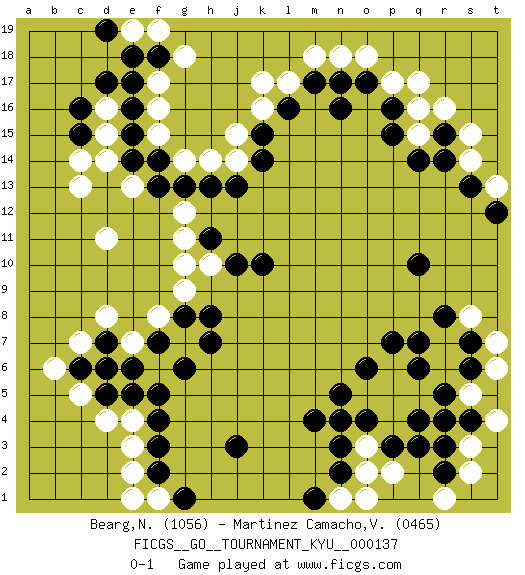 Last move : 0-1 2013 January 23 12:44:39 [Event "FICGS__GO__TOURNAMENT_KYU__000137"] [Site "FICGS"] [Date "2012.08.25"] [Round "1"] [Black "Bearg,Nat"] [White "Martinez Camacho,Victor Hugo"] [Result "0-1"] [Rating 1 "1056"] [Rating 2 "0465"] 1.f4 q16 2.q6 d11 3.k10 k16 4.q14 d16 5.m4 d8 6.q10 d4 7.g8 f8 8.g13 g11 9.h11 g9 10.h8 g10 11.k15 j15 12.k14 j14 13.j13 g14 14.h13 h14 15.f13 g12 16.p16 q15 17.p15 p17 18.o17 q17 19.l16 l17 20.m17 k17 21.n16 o18 22.r15 r16 23.e5 d6 24.d5 c5 25.e6 e7 26.c6 c7 27.d7 b6 28.d6 f6 29.g6 g7 30.h7 e4 31.f5 e3 32.f3 e2 33.f2 e1 34.j3 e13 35.f14 f15 36.e14 d14 37.e15 d15 38.e16 f16 39.e17 f17 40.d17 m18 41.c16 c13 42.c15 c14 43.f18 n18 44.n17 s15 45.r14 s14 46.s13 t13 47.t12 g18 48.f7 f19 49.e18 e19 50.d19 q5 51.q4 p5 52.o6 p4 53.q3 r6 54.p3 p6 55.q7 r4 56.r3 s3 57.p7 o3 58.o4 o5 59.n4 p2 60.n5 s5 61.r5 o2 62.s4 s2 63.r2 r1 64.n3 o1 65.n2 n1 66.m1 t4 67.r4 t6 68.s7 r7 69.r8 t7 70.s6 h10 71.j10 f1 72.g1 s8 0-1 This go game has been lost on time (started : 2012.08.25 16:47:27) Here are the names of the openings (joseki) played in the four corners : Corner q16 : q16 q14 Hoshi (Hwajeom, Seongjeom, Xingwei`) 4-4 Point. The star or hoshi (4-4) point, emphasizing influence at the potential expense of territory. Ikken Takagakari (Hankan Nop'dakeolch'im, Yi Gaojia, 1-Space High Approach). White typically responds at 6-4 or 3-10. White 4-10 is played when White finds play on the right side advantageous. White 4-8 or 3-8 may be played when White has support at top. Corner d4 : f4 d8 Ootakamoku (Chaogao) 6-4 Point. The large takamoku (high) point (6-4), experimented with during the "new fuseki" movement in Japan in the 1930's. This point is seldom played as the initial corner point nowadays. Player White won this Go (weiqi, baduk) game. Follow this game move after move (download)... {it is} something unearthly... if there are sentient beings on other planets, then they play go. (Emanuel Lasker, chess world champion) The Internet is the world's largest library. It's just that all the books are on the floor. (John Allen Paulos)