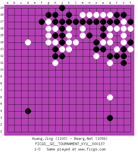Last move : 1-0 2012 December 30 19:42:2 [Event "FICGS__GO__TOURNAMENT_KYU__000137"] [Site "FICGS"] [Date "2012.08.25"] [Round "1"] [Black "Huang,Jing"] [White "Bearg,Nat"] [Result "1-0"] [Rating 1 "1100"] [Rating 2 "1056"] 1.q17 d14 2.d4 q6 3.q3 r16 4.r17 q16 5.p16 q15 6.p15 q14 7.q12 p14 8.n15 m15 9.o14 s17 10.s18 s15 11.t17 s16 12.o17 m16 13.p13 o12 14.o13 q11 15.r12 r13 16.s13 s14 17.s11 t13 18.s12 t16 19.t14 p18 20.p17 q18 21.r18 o18 22.n17 n18 23.m17 m18 24.l17 k16 25.k17 j17 26.j16 h16 27.j15 l14 28.h17 j18 29.h18 h14 30.j14 j13 31.h15 g16 32.k18 g15 33.h13 g14 34.h12 h11 35.j12 k13 36.f17 g17 37.g18 k15 38.j19 k14 39.j17 1-0 Here are the names of the openings (joseki) played in the four corners : Corner q4 : q6 q3 Ootakamoku (Chaogao) 6-4 Point. The large takamoku (high) point (6-4), experimented with during the "new fuseki" movement in Japan in the 1930's. This point is seldom played as the initial corner point nowadays. Corner q16 : q17 r16 Komoku (Somok, Xiao~mu`) 3-4 Point. The komoku (3-4) point is the traditional corner enclosure move.. Corner d4 : d4 1-0 Hoshi (Hwajeom, Seongjeom, Xingwei`) 4-4 Point. The star or hoshi (4-4) point, emphasizing influence at the potential expense of territory. Player Black won this Go (weiqi, baduk) game. Follow this game move after move (download)When you study joseki, you lose two stones in strength. (Anonymous) Man is reluctant to give credit for intelligence to anyone, except his enemies. (Albert Einstein)