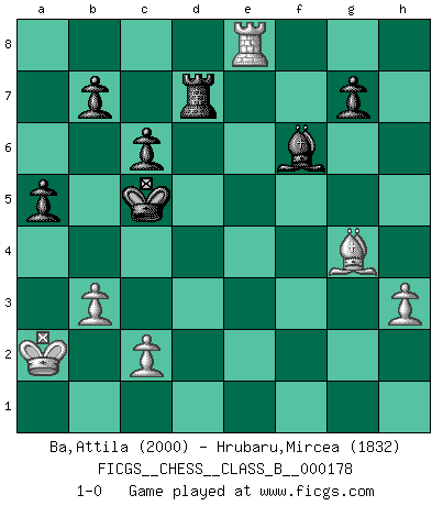 Last move : 1-0 2013 February 22 16:1:49 [Event "FICGS__CHESS__CLASS_B__000178"] [Site "FICGS"] [Date "2012.08.29"] [Round "1"] [White "Ba,Attila"] [Black "Hrubaru,Mircea"] [Result "1-0"] [WhiteElo "2000"] [BlackElo "1832"] 1.Nf3 d5 2.b3 Bg4 3.Ne5 Bf5 4.g4 Be4 5.Rg1 Nd7 6.Bb2 Nxe5 7.Bxe5 Bg6 8.e3 e6 9.Nc3 a6 10.Ne2 Ne7 11.Nf4 Nc6 12.Bb2 Qd6 13.h3 e5 14.Nxg6 hxg6 15.Bg2 O-O-O 16.d3 d4 17.Qd2 Nb4 18.a3 Nd5 19.O-O-O Be7 20.exd4 exd4 21.Rde1 Nc3 22.Bxc3 dxc3 23.Qxc3 Qxa3+ 24.Qb2 Bg5+ 25.Kb1 Qf8 26.Rd1 Qd6 27.d4 Rhe8 28.Qc3 Kb8 29.Qf3 Qb6 30.Qxf7 Bf6 31.Rd3 Re7 32.Qc4 Rxd4 33.Rxd4 Bxd4 34.Rd1 Bxf2 35.Be4 Bh4 36.g5 c6 37.Qg8+ Ka7 38.Rd8 Qg1+ 39.Ka2 Kb6 40.Qc4 Qxg5 41.Qd4+ Qc5 42.Bxg6 Bf6 43.Qxc5+ Kxc5 44.Re8 Rd7 45.Bh5 a5 46.Bg4 1-0 Reti : Nimzovich-Larsen attack Queenside Castling by player Black (move 15) Queenside Castling by player White (move 19) Player White won this chess game. Follow this game move after move (download)I like to say that Bobby Fischer was the greatest player ever. But what made Fischer a genius was his ability to blend an American freshness and pragmatism with Russian ideas about strategy. (Bruce Pandolfini) Vom Schach wurde gesagt das Leben sei dafür nicht lange genug. Aber das ist der Fehler des Lebens, nicht des Schach'. (Irving Chernev) Aquellos que dicen que entienden al Ajedrez, no entienden nada. (Robert Hubner) Le moment que je préfère le plus dans une rencontre, c'est celui où je sens que la personnalité de l'adversaire se brise. (Robert Fischer) Just because you do not take an interest in politics doesn't mean politics won't take an interest in you. (Pericles 430 B.C.)