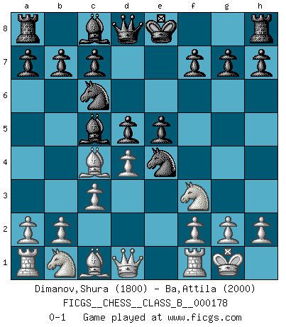 Last move : 0-1 2012 October 10 9:41:42 [Event "FICGS__CHESS__CLASS_B__000178"] [Site "FICGS"] [Date "2012.08.29"] [Round "1"] [White "Dimanov,Shura"] [Black "Ba,Attila"] [Result "0-1"] [WhiteElo "1800"] [BlackElo "2000"] 1.e4 e5 2.Nf3 Nc6 3.Bc4 Nf6 4.O-O Bc5 5.c3 Nxe4 6.d4 d5 0-1 This chess game has been lost on time (started : 2012.08.29 20:14:25) Two knights defense Kingside Castling by player White (move 4) Player Black won this chess game. Follow this game move after move (download)I love all positions. Give me a difficult positional game, I will play it. But totally won positions, I cannot stand them. (Hein Donner) Wenn Dein Gegner dir ein Remis anbietet, versuch herauszufinden, weshalb er glaubt schlechter zu stehen. (Nigel Short) El Ajedrez es un regaderazo frío para la mente. (Sir John Simon) Les échecs c'est le défi de l'alpiniste, toujours plus haut, prêt à tout pour monter à l'assaut du Roi ennemi. Les échecs, c'est de la musique en mouvement, un ballet majestueux pour les yeux. C'est de la poésie composée par les fantômes du passé qui au même titre que Rimbaud ou Verlaine méritent notre admiration. Les échecs, c'est de la peinture ou le moindre mouvement modifie le tableau pour en faire un Picasso ou un Van Gogh. Les échecs, c'est tout et rien, c'est la vie et la mort. Jjulie33 sur le forum de France-Echecs. Optimism is a variety of information deficit. Sometimes especially true for correspondence chess games. (Michael Aigner)
