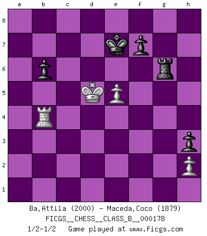 Last move : 1/2-1/2 2013 January 27 8:12:47 [Event "FICGS__CHESS__CLASS_B__000178"] [Site "FICGS"] [Date "2012.08.29"] [Round "1"] [White "Ba,Attila"] [Black "Maceda,Coco"] [Result "1/2-1/2"] [WhiteElo "2000"] [BlackElo "1879"] 1.Nf3 Nf6 2.c4 g6 3.d4 Bg7 4.Nc3 d5 5.cxd5 Nxd5 6.e4 Nxc3 7.bxc3 c5 8.Be3 Qa5 9.Bd2 O-O 10.Be2 Bg4 11.O-O Rd8 12.a3 Bxf3 13.Bxf3 cxd4 14.cxd4 Qa6 15.Be2 Qd6 16.Ba5 b6 17.Bb4 Qd7 18.e5 Nc6 19.Bb5 Rac8 20.Qa4 Qe6 21.Bxc6 Qxc6 22.Qxc6 Rxc6 23.Bxe7 Rxd4 24.Rae1 Rc2 25.g3 Bf8 26.Bxf8 Kxf8 27.Rc1 Re2 28.Rfe1 Rxe1+ 29.Rxe1 Rd3 30.a4 Rd4 31.Ra1 Re4 32.f4 g5 33.a5 gxf4 34.axb6 axb6 35.gxf4 Rxf4 36.Rb1 Rg4+ 37.Kf2 Rg6 38.Ke3 h5 39.Ke4 h4 40.Rb2 Ke7 41.Kd5 h3 42.Rb3 Rh6 43.Rb4 Rg6 1/2-1/2 Reti Opening Kingside Castling by player Black (move 9) Kingside Castling by player White (move 11) 10 pieces endgame at move 35 : White KRPPP , Black KRPPP WHITE : King + 1 Rook 3 Pawns BLACK : King + 1 Rook 3 Pawns 9 pieces endgame at move 35 : White KRPP , Black KRPPP WHITE : King + 1 Rook 2 Pawns BLACK : King + 1 Rook 3 Pawns This chess game ended in a draw. Follow this game move after move (download)Some part of a mistake is always correct. (Savielly Tartakover) Der Traum, für den ich lebe, ist der von einem freien Russland. Viele mögen sagen: Russland hat doch ein Parlament, einen gewählten Präsidenten. Aber ich spüre, dass in meiner Heimat die Angst wiederkehrt. Eine Angst, sich frei zu äußern, bestimmte Dinge zu tun (Garry Kasparov) El Ajedrez es parte de la cultura, y si una cultura esta en decadencia, entonces también el Ajedrez declinará. (Mikhail Botvinnik) C'est la seule position que je connaisse où les deux camps sont mals. Propos prêtés à V. Anand. If only people were all showed a certain minimum level of niceness; if only people didn't retract verbal draw offers (without draw box ticked) on ficgs; if only people didn't kill; if only people didn't run concentration / extermination camps, if only people didn't drop nuclear bombs on Hiroshima and Nagasaki, and so on - it would be a much more beautiful world. But sadly, things are not so... (Normajean Yates)