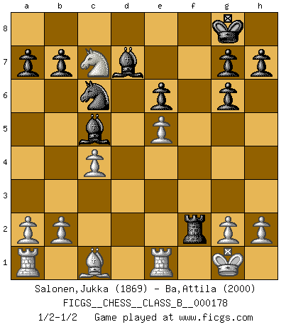 Last move : 1/2-1/2 2012 September 4 15:46:52 [Event "FICGS__CHESS__CLASS_B__000178"] [Site "FICGS"] [Date "2012.08.29"] [Round "1"] [White "Salonen,Jukka"] [Black "Ba,Attila"] [Result "1/2-1/2"] [WhiteElo "1869"] [BlackElo "2000"] 1.e4 e6 2.d4 d5 3.e5 c5 4.c3 Ne7 5.Nf3 Nbc6 6.Bd3 Bd7 7.O-O Ng6 8.Qe2 Be7 9.Rd1 O-O 10.dxc5 Bxc5 11.c4 Qc7 12.Bxg6 fxg6 13.Nc3 Rxf3 14.Qxf3 Rf8 15.Nxd5 Rxf3 16.Nxc7 Rxf2 17.Re1 Re2 18.Kf1 Rf2+ 19.Kg1 1/2-1/2 French : Advance variation Kingside Castling by player White (move 7) Kingside Castling by player Black (move 9) This chess game ended in a draw. Follow this game move after move (download)A big shock; the best chess player in history has passed away. (Lajos Portisch, about Bobby Fischer's death) Mein Gehirn das ist mein zweitwichtigstes Organ [Aus dem Film: Der Schläfer]. (Woody Allen) No nos podemos resistir a la fascinación de un sacrificio ya que la pasión por los sacrificios es parte de la naturaleza de un jugador de Ajedrez. (Rudolf Spielman) La tactique, c'est ce que vous faites quand il y a quelque chose à faire; la stratégie, c'est ce que vous faites quand il n'y a rien à faire. (Savielli Tartacower) If you are good, you will be assigned all the work. If you are really good, you will get out of it. (Dan Rotaru)