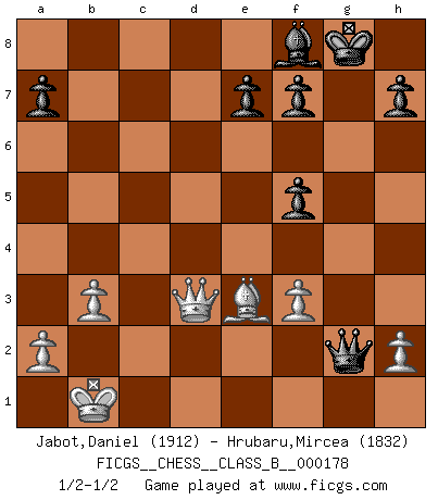 Last move : 1/2-1/2 2012 November 25 22:10:47 [Event "FICGS__CHESS__CLASS_B__000178"] [Site "FICGS"] [Date "2012.08.29"] [Round "1"] [White "Jabot,Daniel"] [Black "Hrubaru,Mircea"] [Result "1/2-1/2"] [WhiteElo "1912"] [BlackElo "1832"] 1.e4 c5 2.Nf3 d6 3.d4 cxd4 4.Nxd4 Nf6 5.Nc3 g6 6.Be3 Bg7 7.f3 O-O 8.Qd2 Nc6 9.O-O-O d5 10.exd5 Nxd5 11.Nxc6 bxc6 12.Nxd5 cxd5 13.Qxd5 Qc7 14.Qc5 Qb7 15.Qa3 Bf5 16.Bd3 Rab8 17.b3 Qc6 18.Qa5 Rfc8 19.Bxf5 gxf5 20.c4 Qe6 21.Rhe1 Rxc4+ 22.Kb1 R4c8 23.Rd3 Qc6 24.Rc1 Qg6 25.Rxc8+ Rxc8 26.Rd8+ Rxd8 27.Qxd8+ Bf8 28.Qd3 Qxg2 1/2-1/2 Sicilian : Dragon, Yugoslav attack, 7...O-O Kingside Castling by player Black (move 7) Queenside Castling by player White (move 9) This chess game ended in a draw. Follow this game move after move (download)When in doubt... play Chess ! (Tevis) Gewinnen beim Schach fördert das Selbstvertrauen. Beim Sex spüre ich sowas nicht... (Garry Kasparov) Un jugador que trata de regresar una movida en el Ajedrez es un futuro carterista. (Richard Fenton) On croit qu'il y a plus de mauvais joueurs que de bons joueurs, c'est faux : Il y a autant de joueurs qui gagnent que de joueurs qui perdent. (Philippe Geluck) Opportunities multiply as they are seized. (Sun Tzu)