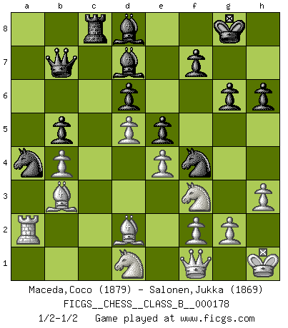 Last move : 1/2-1/2 2013 January 23 15:17:8 [Event "FICGS__CHESS__CLASS_B__000178"] [Site "FICGS"] [Date "2012.08.29"] [Round "1"] [White "Maceda,Coco"] [Black "Salonen,Jukka"] [Result "1/2-1/2"] [WhiteElo "1879"] [BlackElo "1869"] 1.e4 e5 2.Nf3 Nc6 3.Bb5 a6 4.Ba4 Nf6 5.O-O Be7 6.Re1 b5 7.Bb3 d6 8.c3 O-O 9.h3 Na5 10.Bc2 c5 11.d4 Qc7 12.Nbd2 cxd4 13.cxd4 Bd7 14.Nf1 Rac8 15.Ne3 Nc6 16.d5 Nb4 17.Bb1 a5 18.a3 Na6 19.b4 axb4 20.axb4 Qb7 21.Bd2 Nc7 22.Nh4 g6 23.Nf3 Na8 24.Qe2 Nb6 25.Bd3 Na4 26.Rec1 Rxc1+ 27.Rxc1 Nb2 28.Bc2 Rc8 29.Ra1 Nh5 30.Bb3 Bd8 31.Ra2 Nf4 32.Qf1 Na4 33.Nd1 h6 34.Kh1 1/2-1/2 Ruy Lopez : Closed Kingside Castling by player White (move 5) Kingside Castling by player Black (move 8) This chess game ended in a draw. Follow this game move after move (download)Fischer is under obligation to nobody. (Joseph Platz) Je älter ich werde, um so mehr schätze ich die Bauern. (Paul Keres) Una buena ofensiva y una buena defensa, comienzan ambas con un buen desarrollo. (Bruce A. Moon) Mon pion favori sur ma case favorite ! Bronstein en parlant d'un coup de pion en h5 quand il avait les Noirs. The Internet is so big, so powerful and pointless that for some people it is a complete substitute for life. (Andrew Brown)
