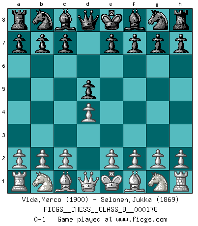 Last move : 0-1 2012 October 9 21:38:20 [Event "FICGS__CHESS__CLASS_B__000178"] [Site "FICGS"] [Date "2012.08.29"] [Round "1"] [White "Vida,Marco"] [Black "Salonen,Jukka"] [Result "0-1"] [WhiteElo "1900"] [BlackElo "1869"] 1.d4 d5 0-1 This chess game has been lost on time (started : 2012.08.29 20:14:25) Queen's pawn game Player Black won this chess game. Follow this game move after move (download)Every Chess master was once a beginner. (Chernev) Mein erstes Ziel war nicht, die Partie zu gewinnen, sondern eine Figur zu opfern. -- der junge (Wilhelm Steinitz) No hay otro maestro que tenga una voluntad terrífica de ganar. Al tablero, el irradía peligro y aún los oponentes mas fuertes tienden a congelarse como liebres cuando olfatean a una pantera. Aún sus debilidades son peligrosas. Con las blancas, su juego de apertura es predecible - te es posible hacer planes en su contra - pero es tan fuerte que tus planes casi nunca funcionan. En el juego medio, su precisión e invención son fabulosas y en finales, tú simplemente no le puedes vencer. (Experto Alemán anónimo) Votre seul travail dans les ouvertures est d'obtenir un milieu de partie jouable. (Lajos Portish) When it is a question of money, everybody is of the same religion. (Voltaire)