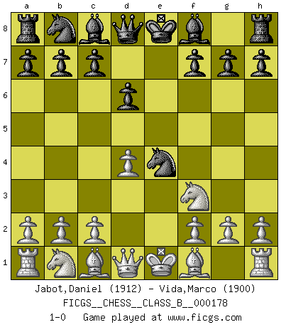 Last move : 1-0 2012 October 9 21:38:20 [Event "FICGS__CHESS__CLASS_B__000178"] [Site "FICGS"] [Date "2012.08.29"] [Round "1"] [White "Jabot,Daniel"] [Black "Vida,Marco"] [Result "1-0"] [WhiteElo "1912"] [BlackElo "1900"] 1.e4 e5 2.Nf3 Nf6 3.Nxe5 d6 4.Nf3 Nxe4 5.d4 1-0 This chess game has been lost on time (started : 2012.08.29 20:14:25) Petrov : Classical attack Player White won this chess game. Follow this game move after move (download)In blitz, the Knight is stronger than the Bishop. (Vlastimil Hort) Darum geht es im Schach. Einen Tag gibst du deinem Gegner eine Lektion, am nächsten Tag gibt er dir eine. (Robert James Fischer) Con o sin el título, Bobby Fischer fue sin lugar a dudas el mas grande jugador de su época. (Burt Hochberg) La solitude du joueur d'Echecs à l'approche du mat est semblable à celle du condamné. (Francis Szpiner) I live to kill Traxler counterattack. (Ilmars Cirulis)