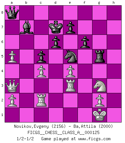 Last move : 1/2-1/2 2013 March 20 13:7:9 [Event "FICGS__CHESS__CLASS_A__000125"] [Site "FICGS"] [Date "2012.08.29"] [Round "1"] [White "Novikov,Evgeny"] [Black "Ba,Attila"] [Result "1/2-1/2"] [WhiteElo "2156"] [BlackElo "2000"] 1.e4 c5 2.c4 Nc6 3.Nc3 g6 4.Nf3 Bg7 5.Be2 d6 6.d3 Nf6 7.O-O Nd7 8.Be3 Nd4 9.Qd2 Nb8 10.h3 Nbc6 11.Rfe1 a6 12.Bh6 O-O 13.Nxd4 Bxh6 14.Qxh6 Nxd4 15.Rac1 b5 16.Bg4 Bb7 17.Ne2 Nc6 18.Qd2 Qb6 19.f4 bxc4 20.dxc4 Rad8 21.b3 a5 22.Qe3 Nd4 23.f5 a4 24.bxa4 Nc6 25.Rb1 Qa5 26.Nc3 Ba6 27.Nd5 Kg7 28.Rec1 f6 29.fxg6 hxg6 30.Qg3 Rh8 31.Rb2 Kf7 32.Nf4 g5 33.Bh5+ Rxh5 34.Nxh5 Ne5 35.Rf2 Rg8 36.Qb3 Qc7 37.Rb2 Rh8 38.Ng3 Qc6 39.a5 Qa8 40.R2b1 Bc8 41.Qa3 g4 42.hxg4 Rg8 43.Rc2 Rxg4 44.Rc3 Bb7 45.Re1 Ke6 46.Re2 Ba6 47.Rec2 Bb7 48.Re3 Kd7 49.R2c3 Rg5 50.Rc2 Rg4 51.R2c3 Rg5 52.Rc2 1/2-1/2 Sicilian defense Kingside Castling by player White (move 7) Kingside Castling by player Black (move 12) This chess game ended in a draw. Follow this game move after move (download)Best by test: 1. e4 (Bobby Fischer) Sie führen leise Selbstgespräche, schlürfen lautstark ihre Getränke, schmatzen hörbar beim Essen, blasen ihrem Gegenüber Rauch in die Augen, niesen ihm ins Gesicht, starren ihn unverwandt an, bis er sich unter ihren Blicken windet, rutschen ständig auf ihrem Stuhl hin und her, rülpsen und bohren in der Nase. (Anonymous) Dios mío, Bobby Fischer juega tan simple. (Alexei Suetin) Les Echecs sont affaire de jugement sensible. Savoir quand frapper et quand esquiver. (Fischer) Question: Is 'This statement is paradoxical' a paradoxical statement ? Or is it a meta-paradox ? (Normajean Yates)