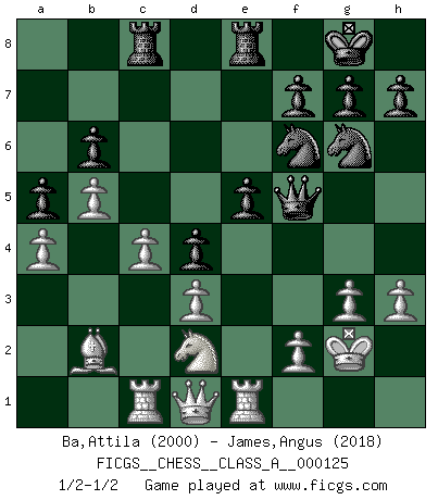 Last move : 1/2-1/2 2012 October 25 12:56:56 [Event "FICGS__CHESS__CLASS_A__000125"] [Site "FICGS"] [Date "2012.08.29"] [Round "1"] [White "Ba,Attila"] [Black "James,Angus"] [Result "1/2-1/2"] [WhiteElo "2000"] [BlackElo "2018"] 1.Nf3 d5 2.b3 Nf6 3.e3 c5 4.Be2 Nc6 5.Bb2 e6 6.O-O Bd6 7.c4 d4 8.exd4 cxd4 9.d3 O-O 10.a3 a5 11.Nbd2 b6 12.h3 Bf4 13.b4 e5 14.b5 Ne7 15.Re1 Ng6 16.a4 Bb7 17.g3 Qd7 18.Bf1 Bxd2 19.Nxd2 Rac8 20.Bg2 Rfe8 21.Bxb7 Qxb7 22.Rc1 Qd7 23.Kg2 Qf5 1/2-1/2 Reti : Nimzovich-Larsen attack Kingside Castling by player White (move 6) Kingside Castling by player Black (move 9) This chess game ended in a draw. Follow this game move after move (download)The mistakes are there, waiting to be made. (Savielly Tartakower) Wer der Ansicht ist, daß alle Schachspieler verrückt sind, wird durch Studium des Lebens von Emil Josef Diemer nicht auf andere Gedanken kommen. (Hans Ree) En la vida, como en el Ajedrez, los Peones propios obstruyen nuestro camino. La gran fortuna de un hombre, su comodidad, placer, hijos, libros, que deberían ayudarle a ganar, con mucha frecuencia lo ponen en Jaque Mate. (Charles Buxton) J'ai toujours senti une vague pitié pour l'homme qui ne connaît rien aux échecs, tout comme j'en aurais pour un homme ignorant de l'amour. Les Echecs, comme la musique ou comme l'amour, ont le pouvoir de rendre heureux. (Siegbert Tarrasch) A shortcut is the longest distance between two points. (Don Groves)