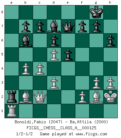 Last move : 1/2-1/2 2012 October 25 21:31:47 [Event "FICGS__CHESS__CLASS_A__000125"] [Site "FICGS"] [Date "2012.08.29"] [Round "1"] [White "Bonoldi,Fabio"] [Black "Ba,Attila"] [Result "1/2-1/2"] [WhiteElo "2047"] [BlackElo "2000"] 1.c4 e5 2.g3 Nf6 3.Bg2 Nc6 4.Nc3 Bb4 5.Nf3 O-O 6.O-O Re8 7.d3 h6 8.e4 d6 9.h3 Bc5 10.Kh2 Nd4 11.Nxd4 Bxd4 12.Ne2 Bc5 13.a3 a5 14.Rb1 Bd7 15.Qc2 Qe7 16.b4 axb4 17.axb4 Bb6 18.Bb2 Ra2 19.Nc3 Ra7 20.Ra1 Rea8 21.Rxa7 Rxa7 22.Nd5 Nxd5 23.exd5 Ra2 24.Ra1 1/2-1/2 English Opening Kingside Castling by player Black (move 5) Kingside Castling by player White (move 6) This chess game ended in a draw. Follow this game move after move (download)You must take your opponent into a deep dark forest where 2+2=5, and the path leading out is only wide enough for one. (Mikhail Tal) Im Blitz ist es einfacher mit einer Figur weniger anzugreifen, als sich mit einer Mehrfigur zu verteidigen. (Mikhail Nekhemyevich Tal) En partidas rápidas, el Caballo es mas poderoso que el Alfil. (Vlastimil Hort) Les échecs sont un jeu par leur forme, un art par leur essence et une science par sa difficulté d'acquisition. Ils peuvent vous procurer autant de plaisir qu'un bon livre ou une belle musique, mais vous n'aurez une réelle joie que si vous arrivez à bien jouer. (Tigran Petrosian) Don't be discouraged. It's often the last key in the bunch that opens the lock. (Author unknown)