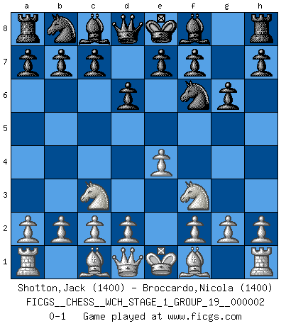 Last move : 0-1 2007 February 19 17:7:53 [Event "FICGS__CHESS__WCH_STAGE_1_GROUP_19__000002"] [Site "FICGS"] [Date "2007.01.16"] [Round "1"] [White "Shotton,Jack"] [Black "Broccardo,Nicola"] [Result "0-1"] [WhiteElo "1400"] [BlackElo "1400"] 1.e4 d6 2.Nf3 Nf6 3.Nc3 g6 0-1 This chess game has been lost on time (started : 2007.01.16 15:30:11) King's pawn Opening Player Black won this chess game. Follow this game move after move (download)Any material change in a position must come about by mate, a capture, or a Pawn promotion. (Purdy) Alle offensichtlichen Züge sehen nach dem Spiel in der Analyse verdächtig aus. (Viktor Kortschnoi) Combinaciones deslumbrantes son para la mayoría, mover madera es para los pocos. (Georg Kieninger) Ce qui est bien, c'est d'avoir tout un tas de pièces en prise : l'adversaire ne peut en prendre qu'une à la fois. Cité par Thierry Audin. Computers have lots of memory but no imagination. (Anonymous)