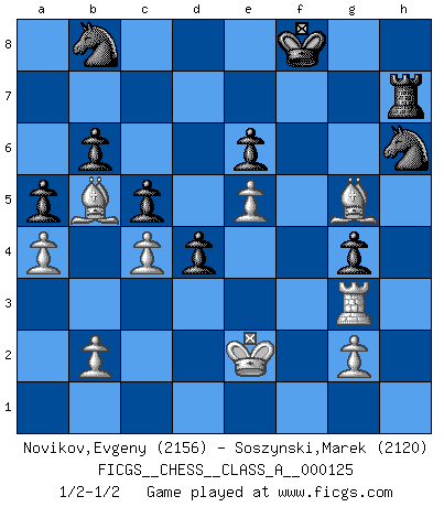 Last move : 1/2-1/2 2013 January 14 5:39:9 [Event "FICGS__CHESS__CLASS_A__000125"] [Site "FICGS"] [Date "2012.08.29"] [Round "1"] [White "Novikov,Evgeny"] [Black "Soszynski,Marek"] [Result "1/2-1/2"] [WhiteElo "2156"] [BlackElo "2120"] 1.e4 b6 2.d4 Bb7 3.Bd3 Nf6 4.Qe2 e6 5.Nf3 c5 6.d5 d6 7.Bb5+ Nfd7 8.dxe6 fxe6 9.O-O h6 10.e5 d5 11.Bd3 Kf7 12.c4 d4 13.Nbd2 Nc6 14.Re1 g5 15.Ne4 Kg8 16.Nd6 Bxd6 17.exd6 Qf6 18.Nd2 Rf8 19.Ne4 Qf7 20.f3 Nce5 21.Bc2 Bxe4 22.Bxe4 Qg7 23.a4 a5 24.Ra3 Rf6 25.Rb3 Qf8 26.f4 Nf7 27.Bc6 Nb8 28.Bb5 Qxd6 29.Rf1 Rh7 30.Rbf3 g4 31.Rg3 h5 32.h3 Nh6 33.hxg4 hxg4 34.Qe5 Qxe5 35.fxe5 Rxf1+ 36.Kxf1 Kf8 37.Ke2 Rh8 38.Bg5 Rh7 1/2-1/2 Owen defense Kingside Castling by player White (move 9) This chess game ended in a draw. Follow this game move after move (download)Chess is played with the mind and not with the hands ! (Renaud and Kahn) Das Schachspiel ist ein See, in welchem eine Mücke baden und ein Elefant ertrinken kann. (Emanuel Lasker) Solo los afeminados hacen el Enroque. (Rob Sillars) Il n'y a pas eu de défaite parce que je ne crois pas que cet ordinateur ait jamais existé. IBM a triché en refusant d'imprimer les modes de recherche de la machine. C'est évident, pendant le match, des coups décisifs ont été joués par des êtres humains. Aujourd'hui, les meilleurs spécialistes en informatique ne peuvent toujours pas expliquer comment Deep-Blue a pu jouer contre la logique des ordinateurs. IBM a gagné une guerre de communication, mais ils sont incapables de prouver que l'ordinateur a gagné tout seul. (Garry Kasparov) Life is like internet, nothing interesting, but noone want to leave it. (Ilmars Cirulis)