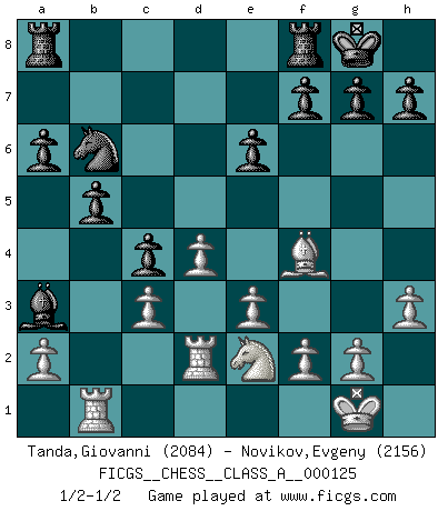 Last move : 1/2-1/2 2013 January 28 13:24:11 [Event "FICGS__CHESS__CLASS_A__000125"] [Site "FICGS"] [Date "2012.08.29"] [Round "1"] [White "Tanda,Giovanni"] [Black "Novikov,Evgeny"] [Result "1/2-1/2"] [WhiteElo "2084"] [BlackElo "2156"] 1.d4 d5 2.Bf4 Nf6 3.e3 c5 4.c3 Bg4 5.Qb3 Qc8 6.Be2 Bxe2 7.Nxe2 c4 8.Qc2 e6 9.b3 Qc6 10.h3 Nbd7 11.Nd2 Ba3 12.O-O O-O 13.bxc4 dxc4 14.Rab1 b5 15.Nf3 a6 16.Rfe1 Qe4 17.Qxe4 Nxe4 18.Red1 Nb6 19.Nd2 Nxd2 20.Rxd2 1/2-1/2 Queen's pawn, Mason variation Kingside Castling by player White (move 12) Kingside Castling by player Black (move 12) This chess game ended in a draw. Follow this game move after move (download)In the perfect Chess combination as in a first-rate short story, the whole plot and counter-plot should lead up to a striking finale, the interest not being allayed until the very last moment. (Yates and Winter) Ich hatte meine größten Erfolge, als ich 47 Jahre alt war. Kasparow war noch nicht mal 42 und hat das Schach schon im Stich gelassen. (Viktor Kortschnoi) Cuando no sepas que mover, espera por una idea que se le venga a la la cabeza de tu oponente. Tenlo por seguro de que esa idea estará incorrecta. (Siegbert Tarrasch) Les ravages du H expliquent la différence de niveau entre Tal et Thal [Abergel]. God, you are such an idiot. - Actually, I thought I was more of a jerk. (Gregory House to Stacy Warner, House M.D.)