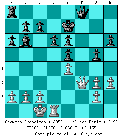 Last move : 0-1 2012 December 21 22:40:35 [Event "FICGS__CHESS__CLASS_E__000155"] [Site "FICGS"] [Date "2012.08.31"] [Round "1"] [White "Gramajo,Francisco"] [Black "Malween,Denis"] [Result "0-1"] [WhiteElo "1395"] [BlackElo "1319"] 1.e4 e5 2.Nf3 Nc6 3.Bb5 a6 4.Bc4 Bc5 5.d3 Nf6 6.Bg5 h6 7.Bh4 d6 8.Nc3 Bg4 9.Nd5 g5 10.Bg3 Nh5 11.h3 Be6 12.d4 Nxd4 13.Nxd4 Bxd4 14.Ne3 Nxg3 15.fxg3 Bxe3 16.Bxe6 fxe6 17.Qh5+ Ke7 18.Rf1 Rf8 19.Rf3 Rxf3 20.Qxf3 Bb6 21.O-O-O Qf8 0-1 Ruy Lopez (Spanish Opening) Queenside Castling by player White (move 21) Player Black won this chess game. Follow this game move after move (download)Chess is as much a mystery as women. (Purdy) Eine Person mit durchschnittlichem IQ kann etwa eine ELO von 2000 erreichen. (Jonathan Levitt) En el Ajedrez, tal como es jugado por los Maestros, practicamente la suerte es eliminada. (Emanuel Lasker) Les échecs sont un jeu par leur forme, un art par leur essence et une science par sa difficulté d'acquisition. Ils peuvent vous procurer autant de plaisir qu'un bon livre ou une belle musique, mais vous n'aurez une réelle joie que si vous arrivez à bien jouer. (Tigran Petrosian) A woman without a man is like a fish without a bicycle. (Gloria Steinem)