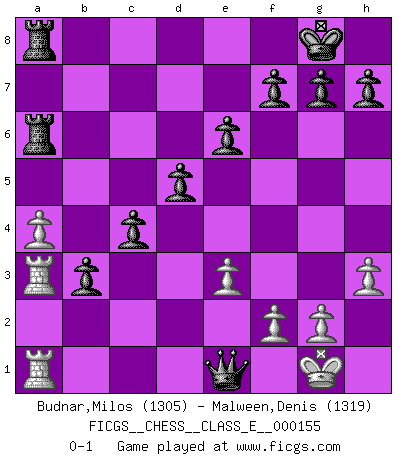 Last move : 0-1 2012 November 26 8:42:42 [Event "FICGS__CHESS__CLASS_E__000155"] [Site "FICGS"] [Date "2012.08.31"] [Round "1"] [White "Budnar,Milos"] [Black "Malween,Denis"] [Result "0-1"] [WhiteElo "1305"] [BlackElo "1319"] 1.d4 Nf6 2.c4 e6 3.Nf3 Bb4+ 4.Bd2 Be7 5.Nc3 d5 6.c5 b6 7.e3 bxc5 8.Bb5+ c6 9.Be2 Nbd7 10.Ne5 Qc7 11.Nxd7 Nxd7 12.dxc5 Nxc5 13.O-O Nd7 14.h3 O-O 15.a3 a5 16.Na4 Ba6 17.Bxa6 Rxa6 18.b4 Rfa8 19.Nc5 Nxc5 20.bxc5 Bxc5 21.a4 Bb4 22.Ra2 c5 23.Bxb4 axb4 24.Qb3 Qd6 25.Rfa1 c4 26.Qd1 b3 27.Ra3 Qb4 28.Qe1 Qxe1+ 0-1 Bogo-Indian defense Kingside Castling by player White (move 13) Kingside Castling by player Black (move 14) Player Black won this chess game. Follow this game move after move (download)Up to this point White has been following well-known analysis. But now he makes a fatal error: he begins to use his own head. (Siegbert Tarrasch) Bis jetzt ist Weiß einer wohlbekannten Analyse gefolgt. Aber jetzt begeht er einen schrecklichen Fehler: Er beginnt seinen eigenen Kopf zu benutzen. (Siegbert Tarrasch) El Ajedrez es tan inspirador que yo no creo que un buen jugador sea capaz de tener un pensamiento malo durante una partida. (Wilhelm Steinitz) Même un GMI sait rarement calculer sur plus de cinq coups une attaque à sacrifices. (Rudolf Spielmann) Nowadays, anyone who cannot speak English and is incapable of using the Internet is regarded as backward. (Al-Waleed bin Talal)