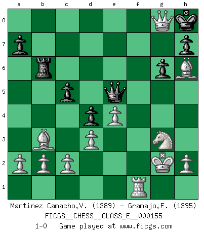 Last move : 1-0 2012 September 29 23:2:57 [Event "FICGS__CHESS__CLASS_E__000155"] [Site "FICGS"] [Date "2012.08.31"] [Round "1"] [White "Martinez Camacho,Victor Hugo"] [Black "Gramajo,Francisco"] [Result "1-0"] [WhiteElo "1289"] [BlackElo "1395"] 1.e4 Nc6 2.Nf3 e5 3.Bb5 Bc5 4.Nc3 Nf6 5.O-O Nd4 6.Nxe5 O-O 7.Ba4 d6 8.Nf3 Bg4 9.d3 c6 10.Bb3 Nxf3+ 11.gxf3 Bh3 12.Re1 Nh5 13.f4 Bg4 14.Qxg4 g6 15.f5 Kg7 16.fxg6 Bxf2+ 17.Kxf2 fxg6 18.Kg2 Qf6 19.Be3 Qe5 20.Rf1 Rxf1 21.Rxf1 d5 22.Bc1 d4 23.Ne2 c5 24.Qd7+ Kh8 25.Ng3 Nf6 26.Qxb7 Rb8 27.Qf7 Rb6 28.Bh6 Ng8 29.Qxg8+ 1-0 KP : Nimzovich defense Kingside Castling by player White (move 5) Kingside Castling by player Black (move 6) Player White won this chess game. Follow this game move after move (download)No Chess Grandmaster is normal; they only differ in the extent of their madness. (Viktor Korchnoi) Ein Gewinn durch eine ungenaue Kombination, sei sie auch noch so vorzeigbar, erfüllt mich mit Schaudern. (Wilhelm Steinitz) Solo los afeminados hacen el Enroque. (Rob Sillars) On croit qu'il y a plus de mauvais joueurs que de bons joueurs, c'est faux : Il y a autant de joueurs qui gagnent que de joueurs qui perdent. (Philippe Geluck) The quality of decision is like the well-timed swoop of a falcon which enables it to strike and destroy its victim. (Sun Tzu)