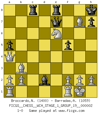 Last move : 1-0 2007 February 8 13:3:32 [Event "FICGS__CHESS__WCH_STAGE_1_GROUP_19__000002"] [Site "FICGS"] [Date "2007.01.16"] [Round "1"] [White "Broccardo,Nicola"] [Black "Barradas,Anderson"] [Result "1-0"] [WhiteElo "1400"] [BlackElo "1059"] 1.c4 Nf6 2.Nc3 e6 3.e4 d5 4.e5 Nfd7 5.cxd5 Nxe5 6.d4 Ng6 7.Bb5+ c6 8.dxc6 bxc6 9.Ba4 Bb4 10.Nge2 O-O 11.O-O Bd7 12.Nf4 Nxf4 13.Bxf4 Na6 14.Bc2 c5 15.Qd3 f5 16.Qxa6 cxd4 17.Ne2 Bc6 18.Qxc6 Qe7 19.Nxd4 Rac8 20.Qa4 a5 21.Bb3 Kh8 22.Nxe6 Rfe8 23.Be5 Bd2 24.Bxg7+ 1-0 English : Mikenas-Carls, Flohr variation Kingside Castling by player Black (move 10) Kingside Castling by player White (move 11) Player White won this chess game. Follow this game move after move (download)One bad move nullifies forty good ones. (Horowitz) Wer der Ansicht ist, daß alle Schachspieler verrückt sind, wird durch Studium des Lebens von Emil Josef Diemer nicht auf andere Gedanken kommen. (Hans Ree) La mitad de las variaciones que son calculadas en una partida de torneo, resultan ser completamente superfluas. Desafortunadamente, nadie sabe por adelantado cual mitad. (Jan Tinman) J'ai toujours senti une vague pitié pour l'homme qui ne connaît rien aux échecs, tout comme j'en aurais pour un homme ignorant de l'amour. Les Echecs, comme la musique ou comme l'amour, ont le pouvoir de rendre heureux. (Siegbert Tarrasch) Life is like a ten-speed bicycle: most of us have gears we never use. (Charles M. Schulz)